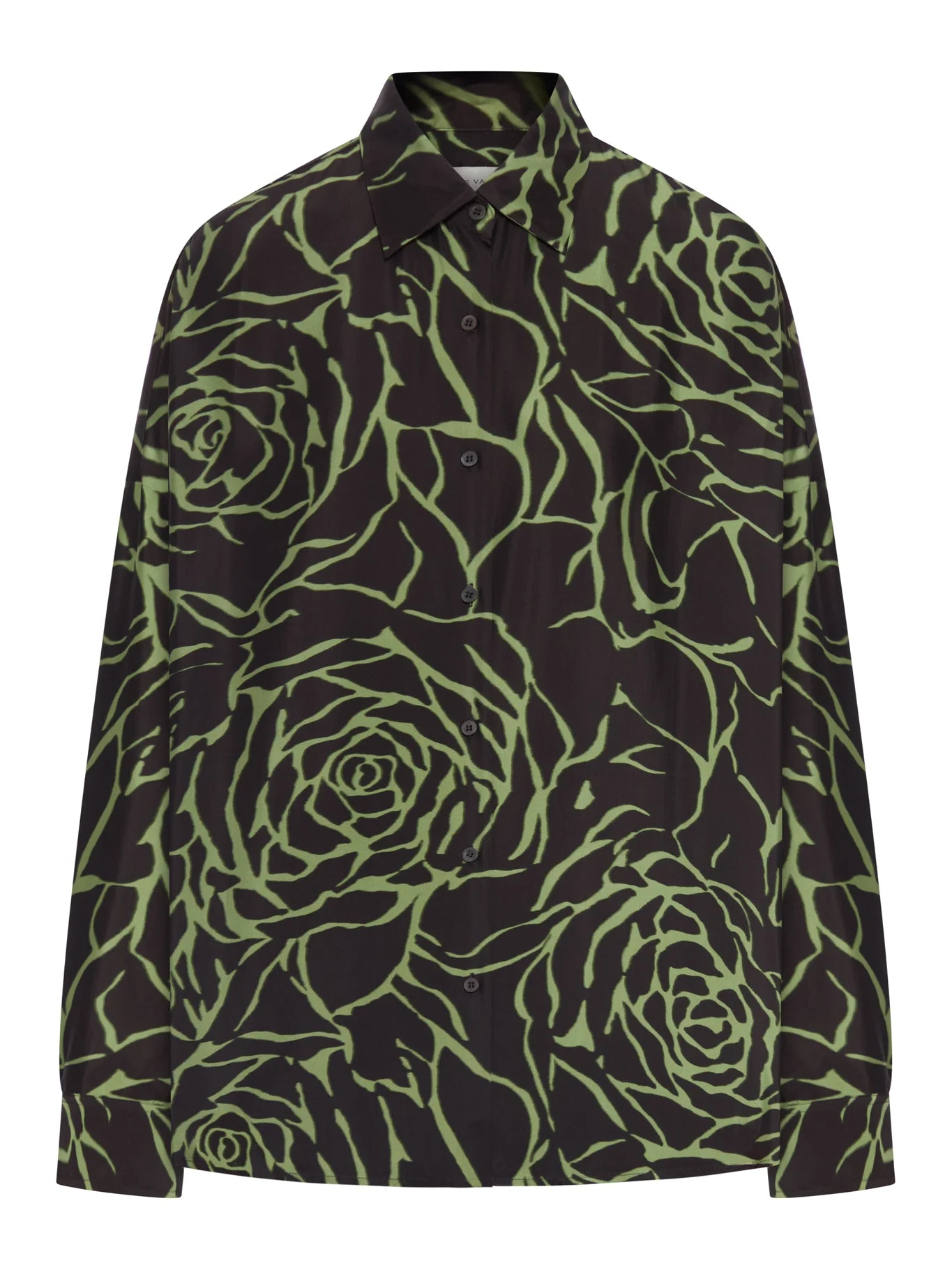 - Classic collar with defined points - Front closure with tone-on-tone buttons - Back yoke with horizontal reinforcement stitching - Long sleeves with shaped cuffs and adjustable button - All-over graphic print with a contrasting stylized floral motif - Slightly rounded hem - Straight fit - Regular fit - Lightweight, flowing fabric - Regular, finished seams - Color: Black Made in Hungary Composition: Viscose 100% viscose Color code: 900 BLACK 2611307003244