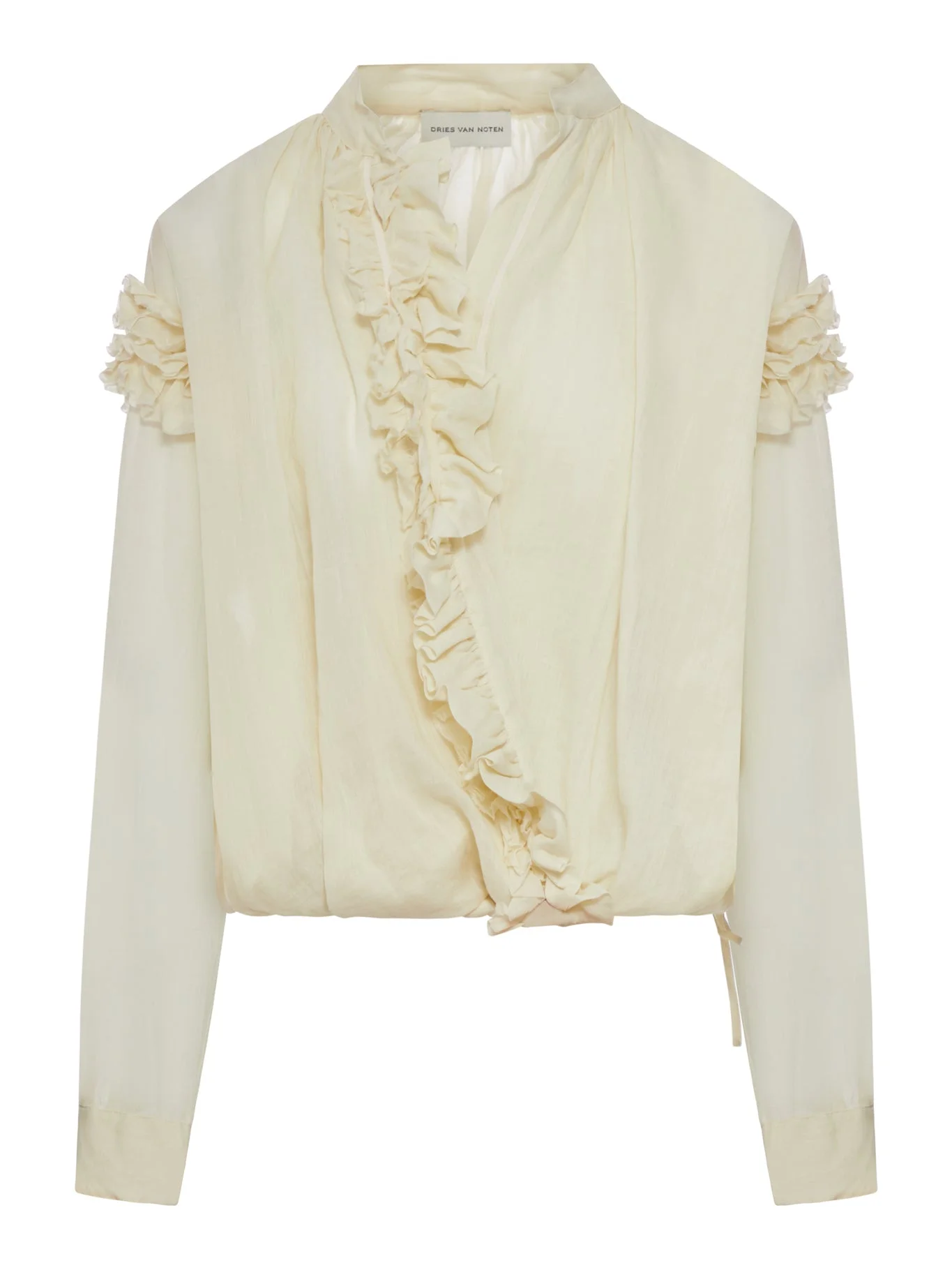- Soft high collar with light gathering - Racerback neckline with maxi ruffles on the front - Gathered shoulders with ruffle detail - Long sleeves - Structured cuffs and tone-on-tone buttons - Slightly balloon hem with adjustable side drawstring - Flowing fit - 100% ramie - Color: Ivory Made in Poland Composition: Raimie 100% Raimie Color code: 006 IVORY 2610107453112