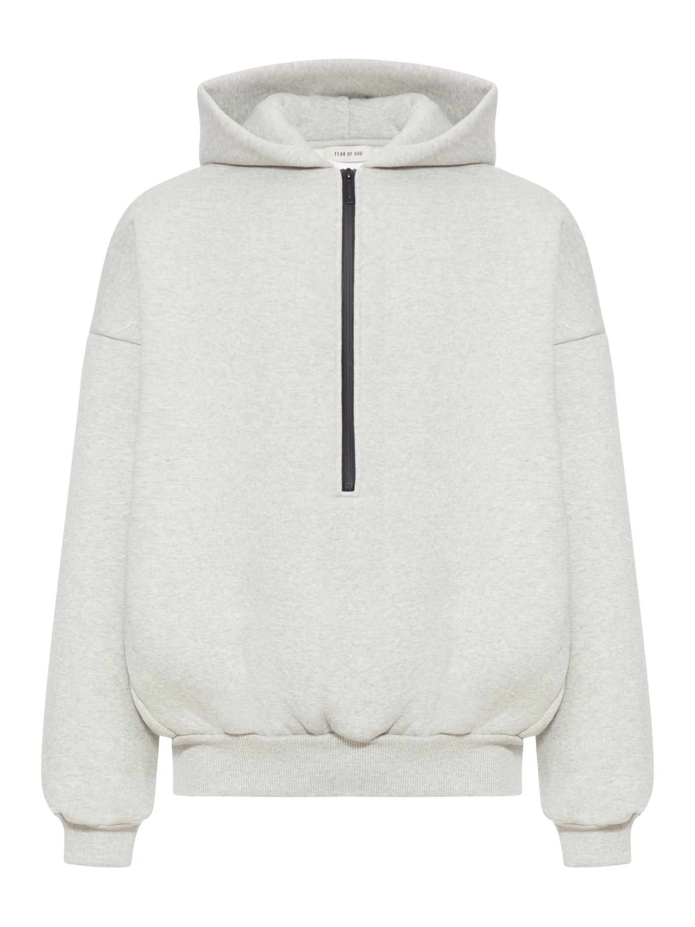 - Double-layer hood - Dropped shoulders - Half-zip front - Kangaroo pocket - Side pockets - Embossed "A" for Athletics - Ribbed cuffs and waistband - Fear of God label Made in Portugal Composition: Cotton 69% Cotton, 31% Polyester Color code: 054 MELANGE GREY FG25FW12123FLC