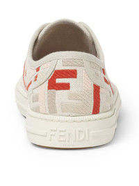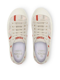 -Rubber box sole -Beige cotton canvas with multicolor FF embroidery in red, pink and dove gray -Finished with tone-on-tone grosgrain ribbon -White sole with contrasting bottom featuring a mix of embossed textures -Overlapping FF pattern on the toe -Fendi Roma logo on the heel -Additional white laces Composition: Cotton 100% Cotton Color code: F1SZE GREZ ROSE BE TOR 8E8325ARIV