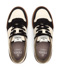 Fendi Match sneaker with a compact design with vintage label on the tongue. Personalized with FF pattern sewn on the side and Fendi lettering in relief on the sole. Made of beige suede with beige leather details. Finished with yellow terry collar and laces. Rubber cassette sole covered with beige bumper. The model includes a second pair of white terry laces. Made in Italy Composition: Calf Leather 100% Calf Leather Color code: F1FZB BLACK MILK 8E8252AHH2 CARRYOVER