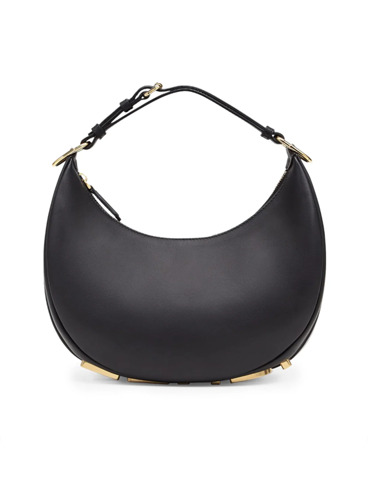 Small size hobo bag made of soft leather decorated with vintage gold metal FENDI lettering visible when wearing the bag under the arm. Zip closure and internal compartment lined in fabric, metal accessories with golden finish. It can be worn under the arm or cross-body thanks to the adjustable and removable handle and the hooks that allow the addition of a shoulder strap. Made in Italy Material: Leather Composition: 100% calf Leather Color code: F1HEJ BLACK OVIB 8BR798A5DY