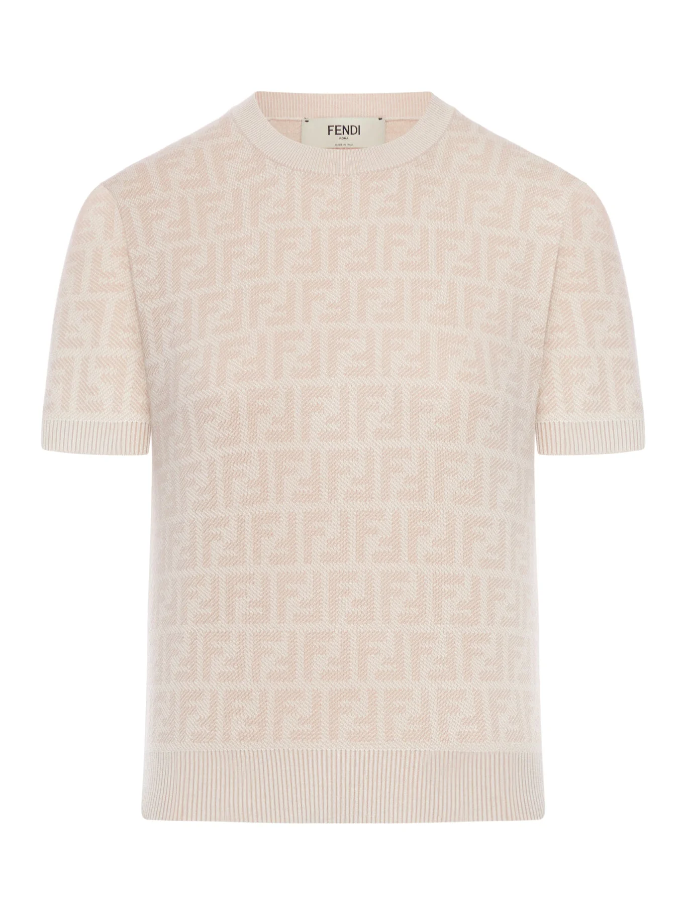 - Crew neck - Short sleeves - Fitted fit - Wool and silk yarn - Iconic all-over jacquard FF motif - Finished with ribbed edges - Color: Pink Made in Italy Composition: Wool 100% wool Color code: F1UKC GRAPEFRUIT 26 FZXE50AYM1