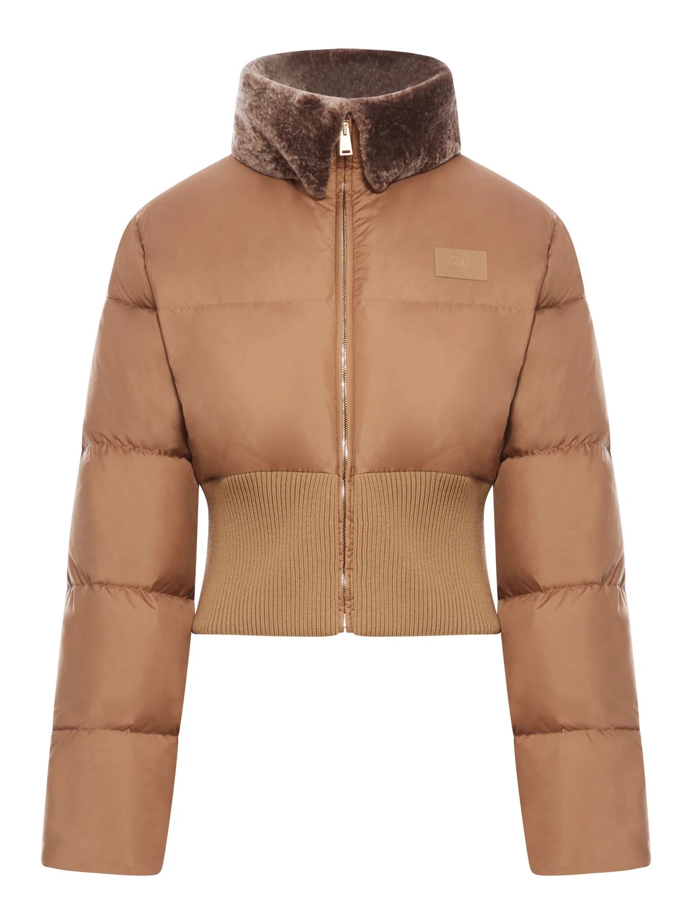- High collar with fur - Long sleeves - Front zip closure - Fendi logo patch on the chest - High elastic ribbed hem - Lined - Slim fit - Color: Camel Made in Italy Composition: Calf Leather 100% Calf leather Color code: F1T6O CAMEL 25 FAN214AT8V