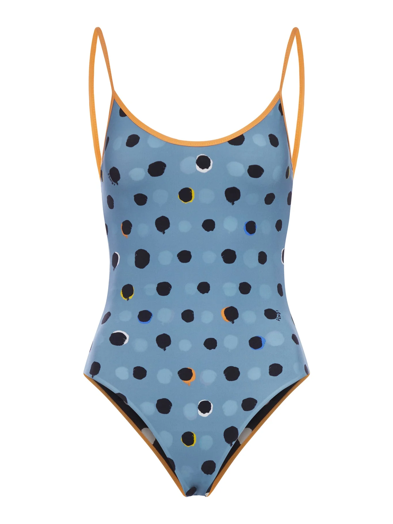 - One-piece swimsuit - Artistic polka dot pattern on a powder blue background, with contrasting color details - Delicate neckline - Thin shoulder straps - Contrasting trim - Comfortable fit - Color: Anise/Black Made in Italy Composition: Cotton 95% Cotton 5% Elastane Color code: F1V3Y ANISE BLACK FXBA70AT9G