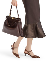 - Colibri Lite Slingback - Thin elastic straps that wrap around the foot - Sole features a rubber insole - Made of jacquard velvet with a brown FF motif - Padded toe cap and trekking hook - Brown patent heel - Heel height: 55 mm Composition: Viscose 46%Viscose 38% cotton ,14% Polyester 2% other fiber Color code: F1TPH BEI CHOCO GIAND CIOC 8J8362AOTP