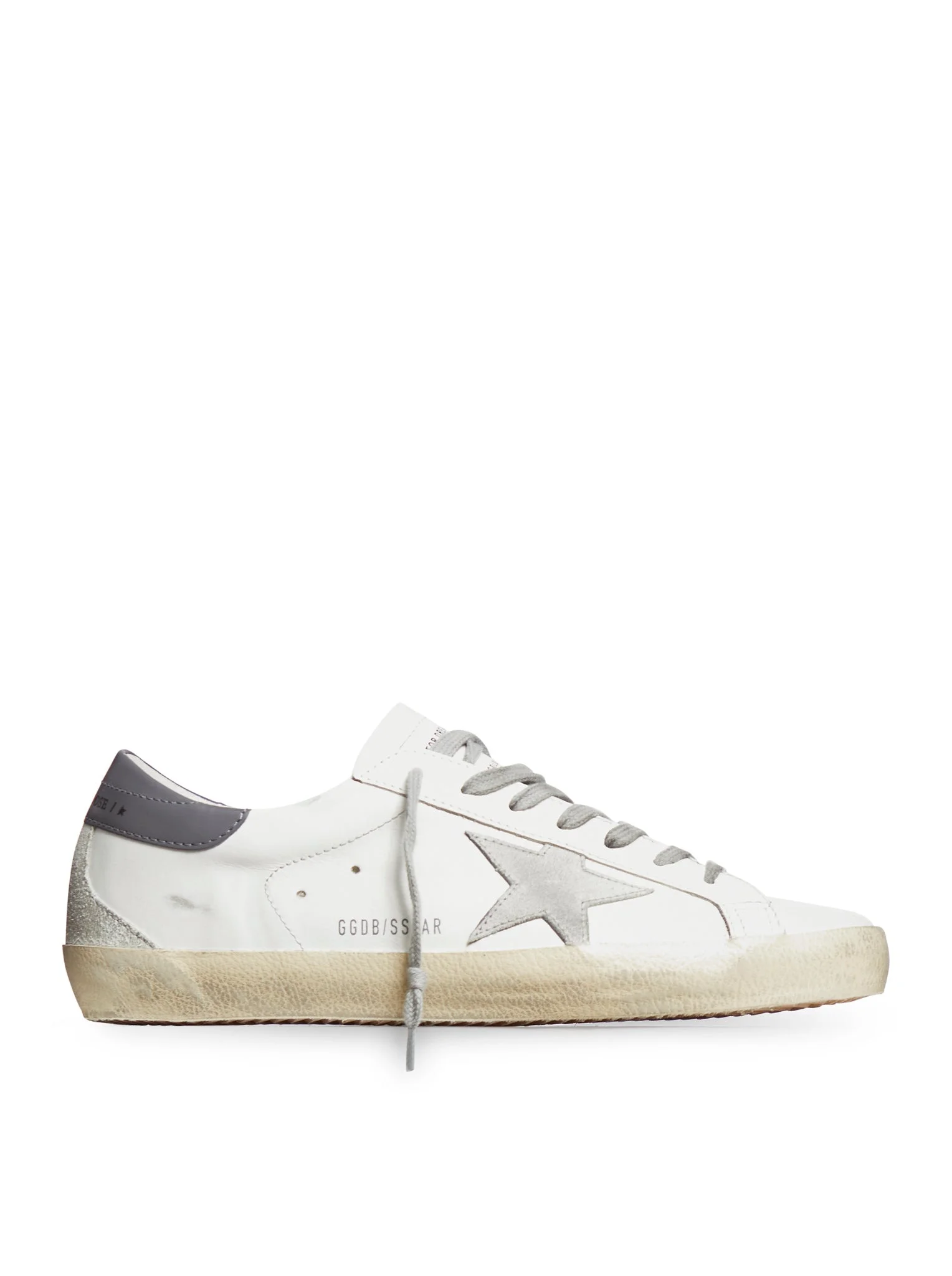 -calfskin -characteristic lateral star application -lived effect -reinforcement on the heel with contrasting logo -front closure with laces -round toe and flat rubber sole Made in Italy Composition: Leather 100% Cow leather Color code: 11915 WHITE ICE DARK GRAY GMF00102F006113