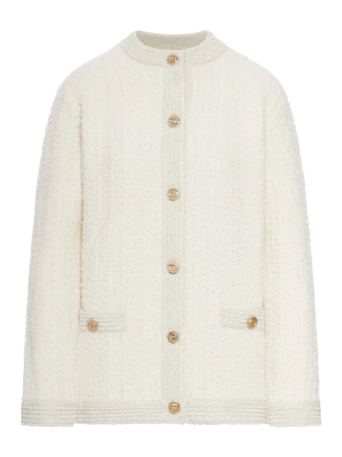 - Ivory lame boucle wool - GG crossover buttons - Crew neck - Front pockets - Long sleeves - Front button closure - Length: 69.5 cm; size S - Color: White Made in Italy Composition: Wool 51% wool 28% poyamide 20% cotton 1% elastane Color code: 9943 IVORY SILVER MC 851946XKFAR