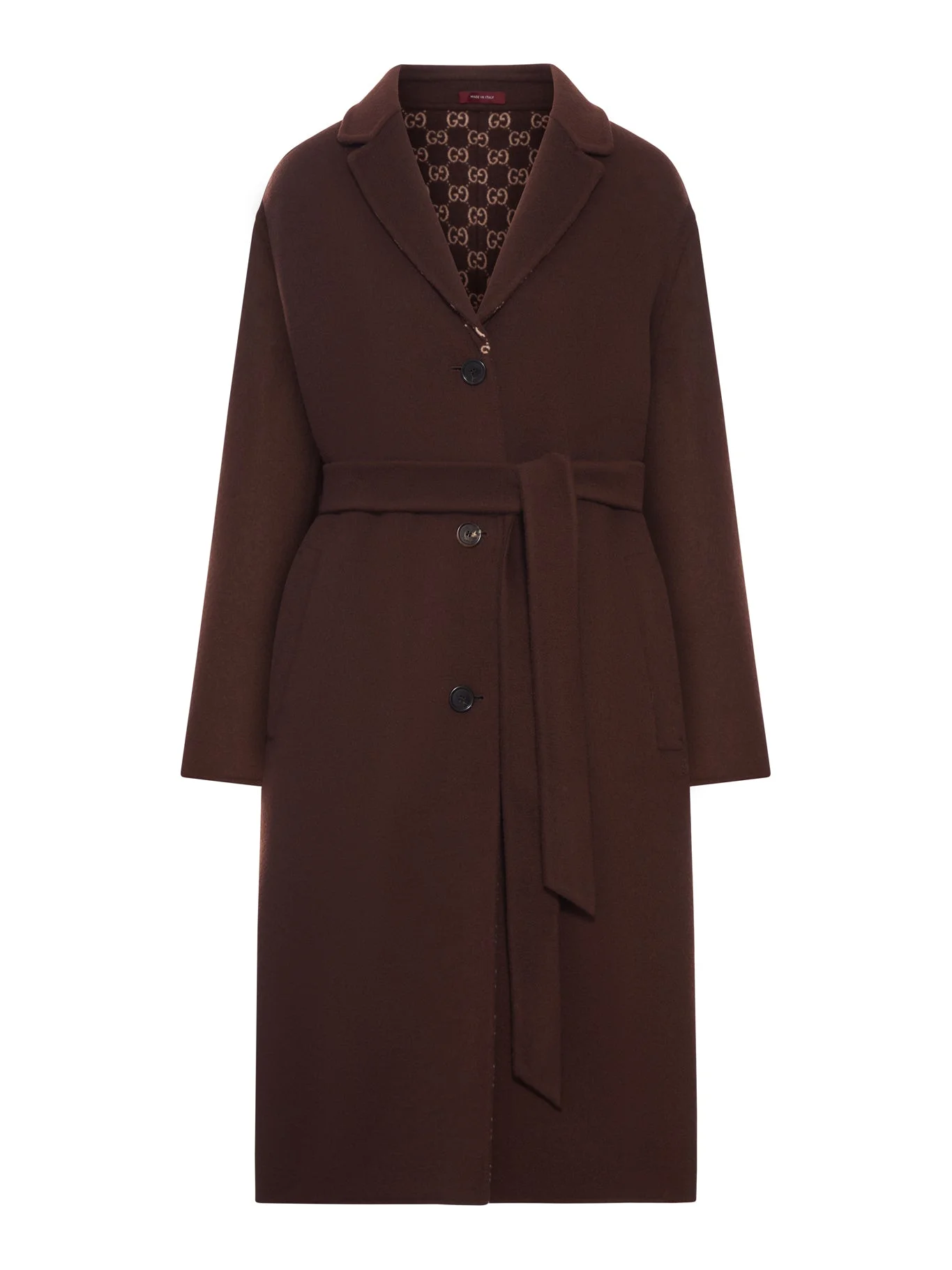 - Classic collar and lapels - Single-breasted with three buttons - Dropped shoulders - Long sleeves - Removable tone-on-tone belt - Two side pockets on the front - Interior with "gg" monogram - Wool - Color: Brown Made in Italy Composition: Wool 99% wool 1% silk Color code: 2016 BROWN PINK 823839Z7ASL