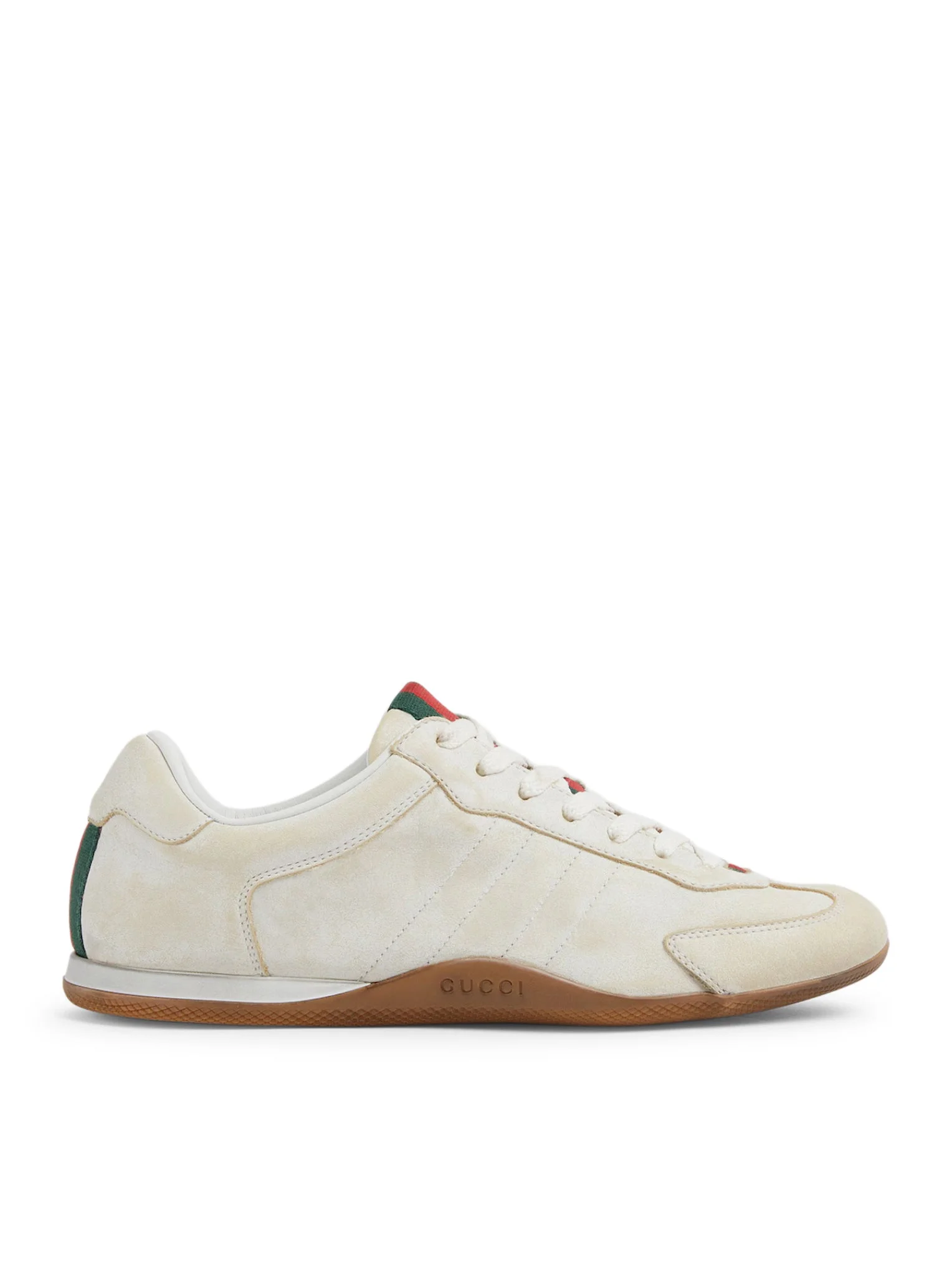 - White washed leather - Leather lining - Red and green Web tongue and back detail - Gucci logo on the sole with two-tone rubber coating - Lace-up closure - Low-top model - Height: 10 mm - Made in Italy - Regular fit - Dedicated dust bag - Color: White Made in Italy Composition: Calf Leather 100% calfskin Color code: 9073 WHITE VRV 857016AAF0E
