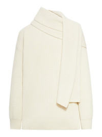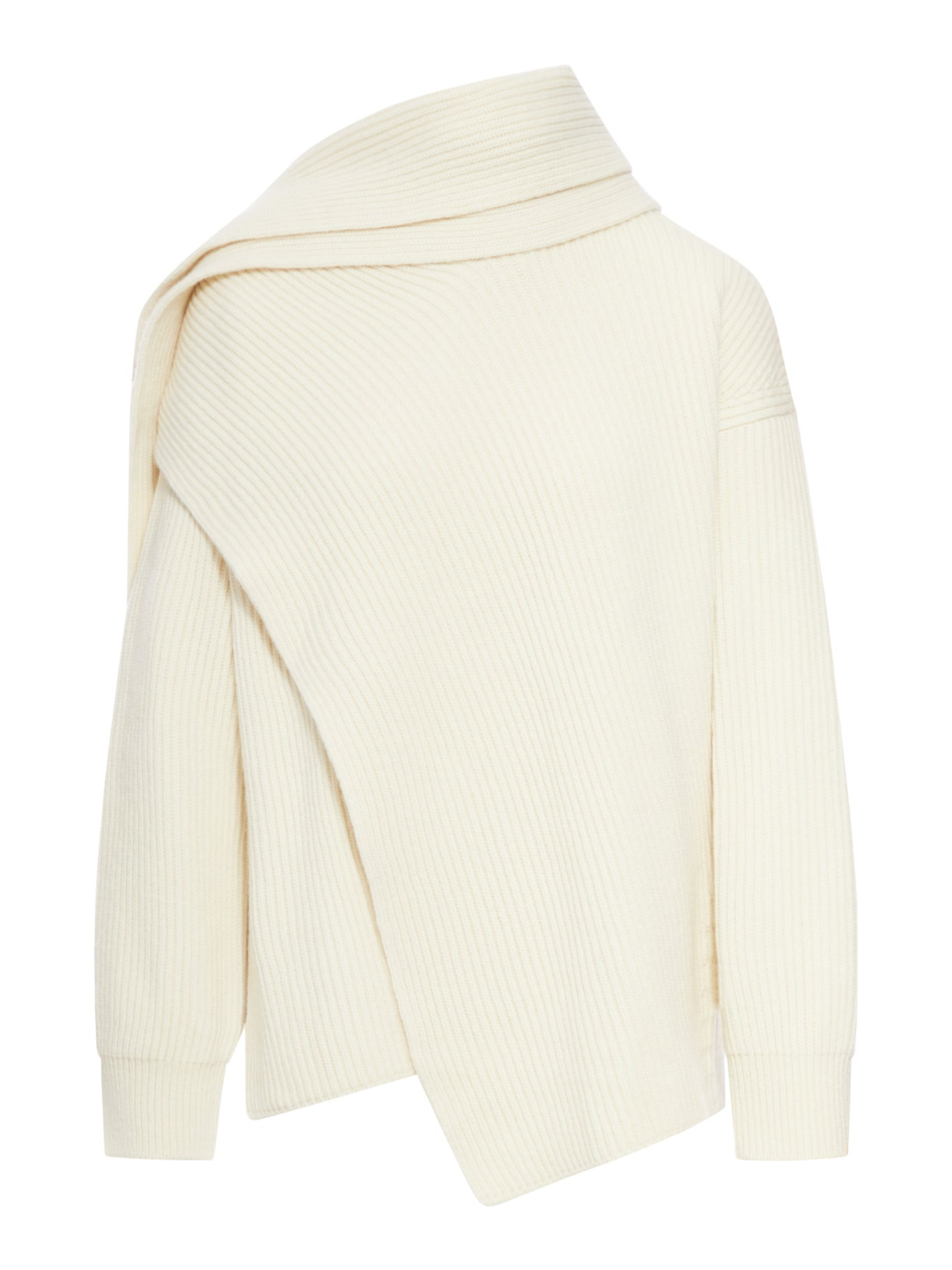 - Crew neck - Fine ribbed wool - Dropped shoulders - Long sleeves - Front panel continues like a scarf - Elasticated ribbed cuffs - Oversize fit Made in Italy Composition: 100% Wool Color code: 106 EGGSHELL J02GP0224J14737