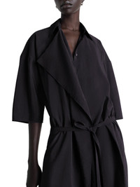 - Asymmetrical shirt dress - Made of dry silk - Loose fit - Classic collar - Mother-of-pearl buttons - Light gathering on the sleeves - Removable matching fabric belt - Center front placket - 3/4 sleeves - The model is 176 cm tall and wears a size 36 (S) - Color: Black Made in Romania Composition: Silk 76% silk 24% polyamide Color code: BK999 BLACK DR1162LF1308