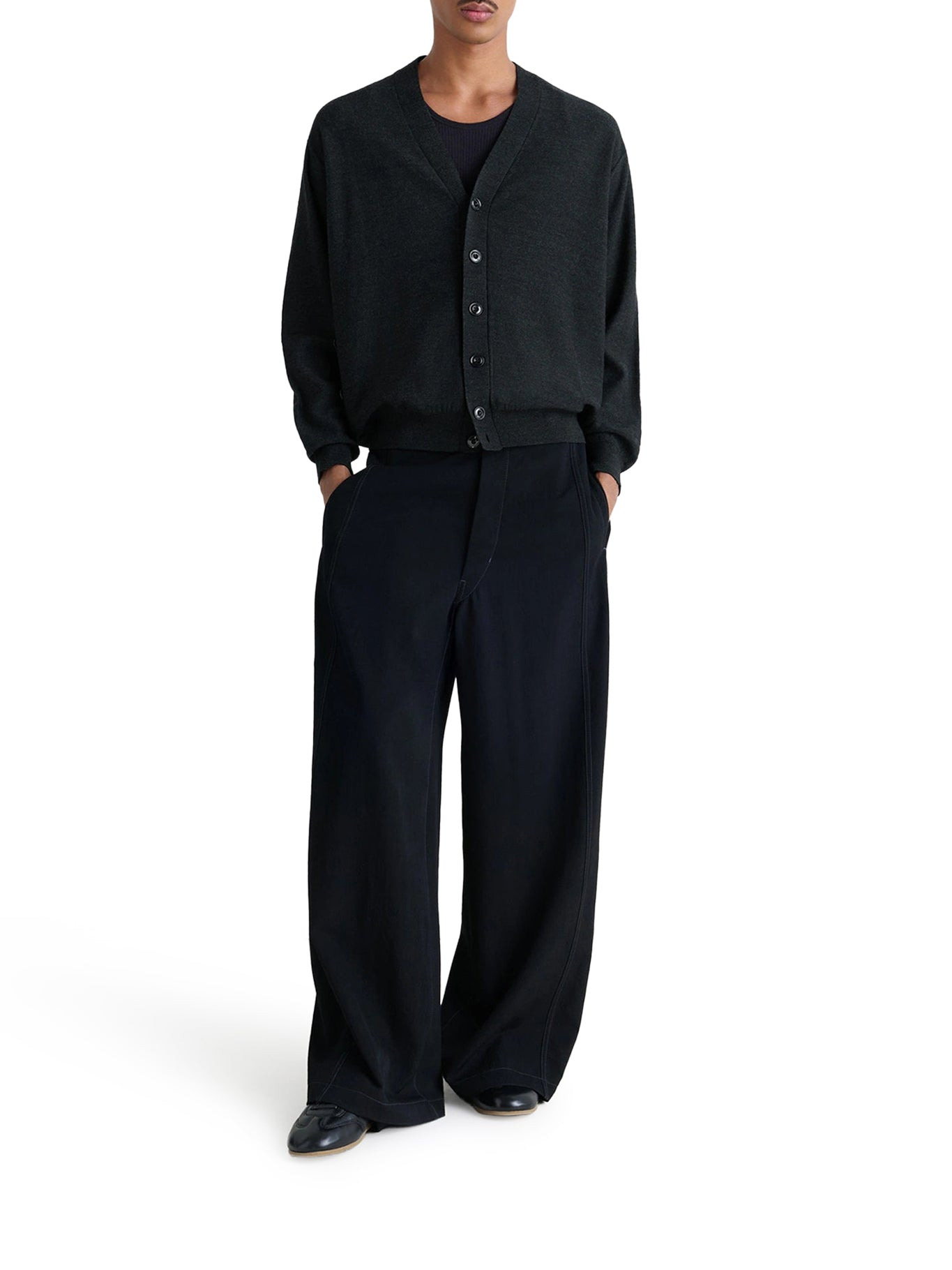 - Relaxed merino wool blend woven cardigan - V-neck - Button closure - Side buttons for asymmetrical closure - Long sleeves - Ribbed knit trims Made in Portugal Composition: Acrylic 50% Acrylic 50% wool Color code: BK966 ANTHRACITE TO1082LK087