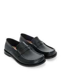 - Waxed calfskin loafers - Iconic asymmetrical round toe - Folding back in soft lambskin nappa - Heel: 20 mm - Side tab with embossed LOEWE motif - Padded leather insole - Leather sole - Injected rubber sole Made in Italy Composition: Calf Leather 100% Calf leather Color code: 1100 BLACK M816290X47
