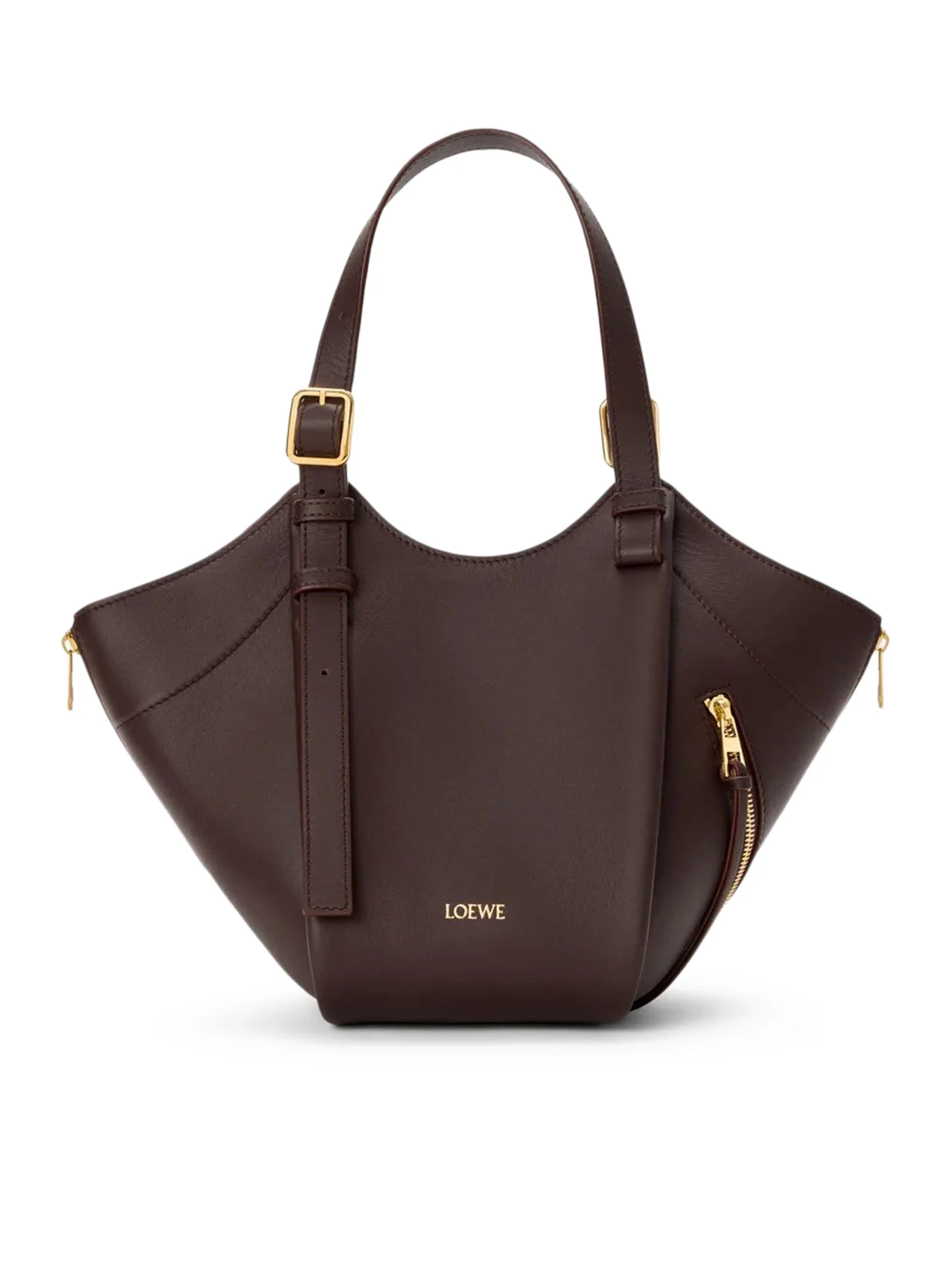 - Classic calfskin - Can be carried over the shoulder, cross-body, or by hand - Adjustable and removable shoulder strap - Magnetic closure - One exterior zip pocket - Two interior open pockets - Herringbone cotton canvas lining - Gold-embossed LOEWE logo - Shoulder strap length: 82 - 111 cm - Shoulder strap height: 38 - 53 cm - Handle drop: 17 - 27 cm - Weight: 0.58 kg - Height: 21 cm - Width: 15 cm - Depth: 22.5 cm - Color: Dark Brownie Made in Spain Composition: Calf Leather 100% Calfskin Color code: 0018 DARK CHESTNUT A538HHBX07