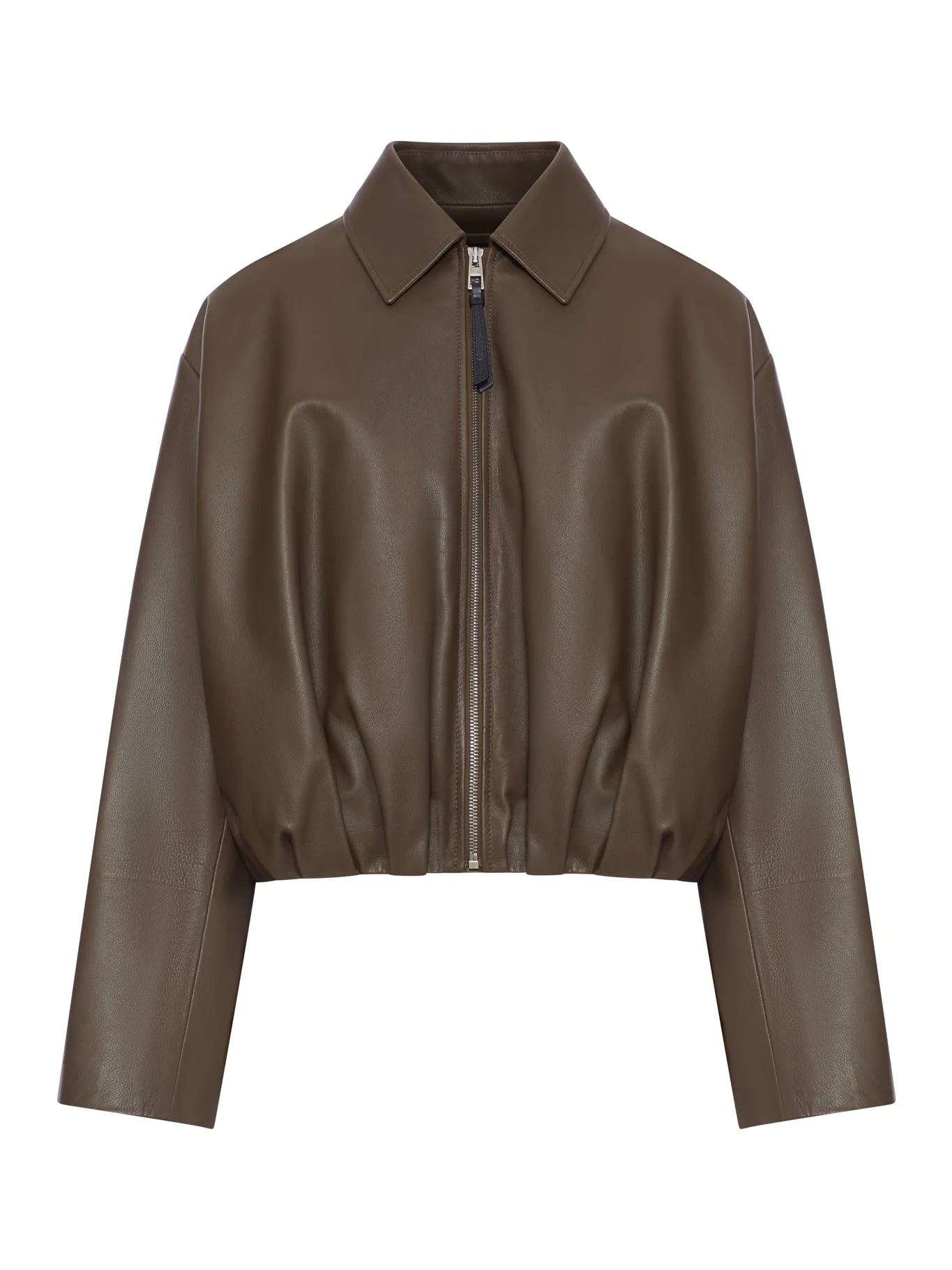 - Classic collar - Front metal zip closure - Structured and draped volume - Cropped fit - Long straight sleeves - Iconic detail on the back with contrasting leather logo insert - Smooth lining - 100% leather - Color: Dark green Made in Italy Composition: Calf Leather 100% Calfskin Color code: 4110 DARK GREEN S359Y34LAN