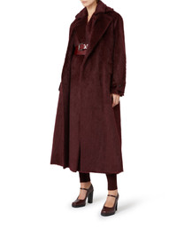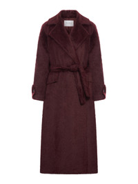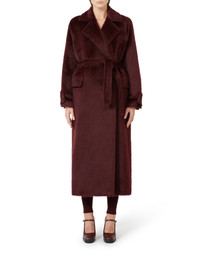 - Alpaca and virgin wool blend coat - Furry effect - Notch lapel - Removable belt - Horizontal welt pockets with flaps - Long raglan sleeves with toggles at the cuffs - Center back vent - Loose, wrap-around silhouette - Lined - Oversized fit - The model wears a size 40 (IT) and is 179 cm tall. Her measurements are: waist 61 cm and hips 90 cm - Color: Cherry Made in Italy Composition: Alpaca 75% Alpaca 25% Wool Color code: 003 CILIEGIA 2521016373600