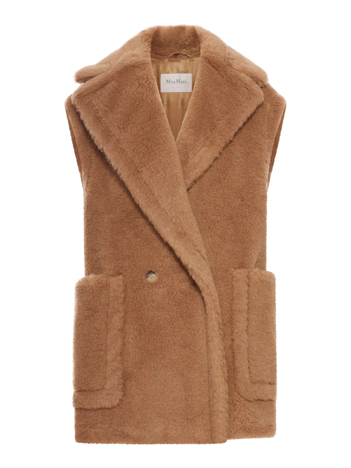 - Sleeveless - Wide collar - Peak lapels - Single-breasted front button closure - Two large patch pockets on the front - Color: Beige Made in Italy Composition: Camel Hair 88% Camel hair, 12% Silk Color code: 001 BEIGE 2521276263600