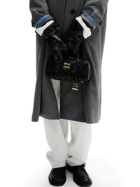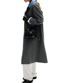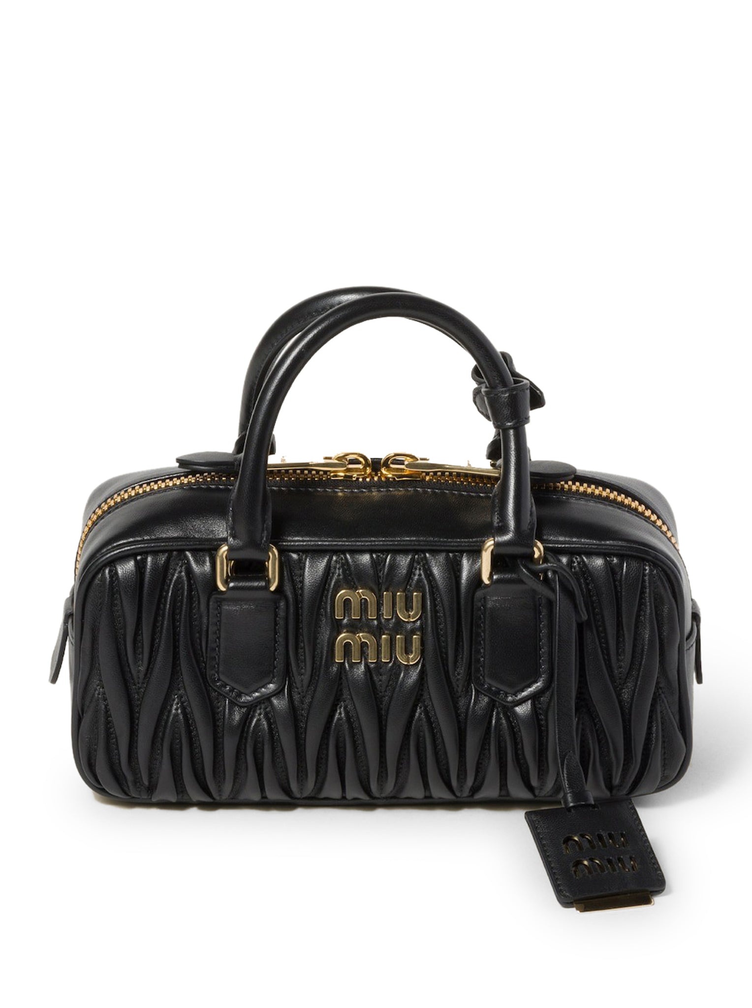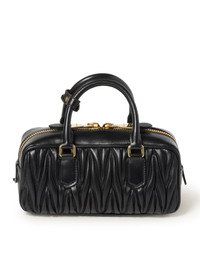 -Matelasse workmanship -Leather handles -Adjustable and removable leather shoulder strap 105 cm long -Removable leather mirror holder -Gold finishes -Metal front lettering logo -Zip closure -Cotton satin interior with zip pocket -With feet -Height 10.5cm -Width 22cm -Length 7.5cm -Black Made in Italy Composition: Lamb Skin 100% Lamb Skin Color code: F0002 BLACK 5BB142VOONAN88