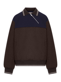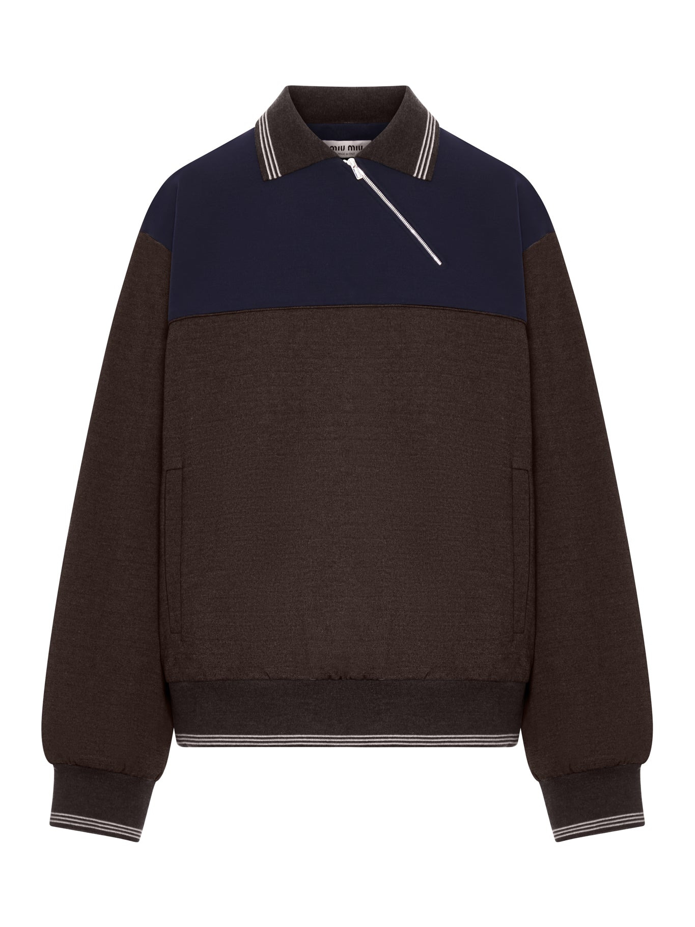 - Loose fit - Long sleeves with knitted cuffs - Polo collar - Front zip closure - Side pockets - Straight hem with knitted trim - Embroidered logo - The model is 177 cm tall and wears a size 38 Made in Italy Composition: Viscose 85% Viscose 11% polyamide 4% elastane Color code: F0KGN CACAO BLUE MJLA01SOOO18FX