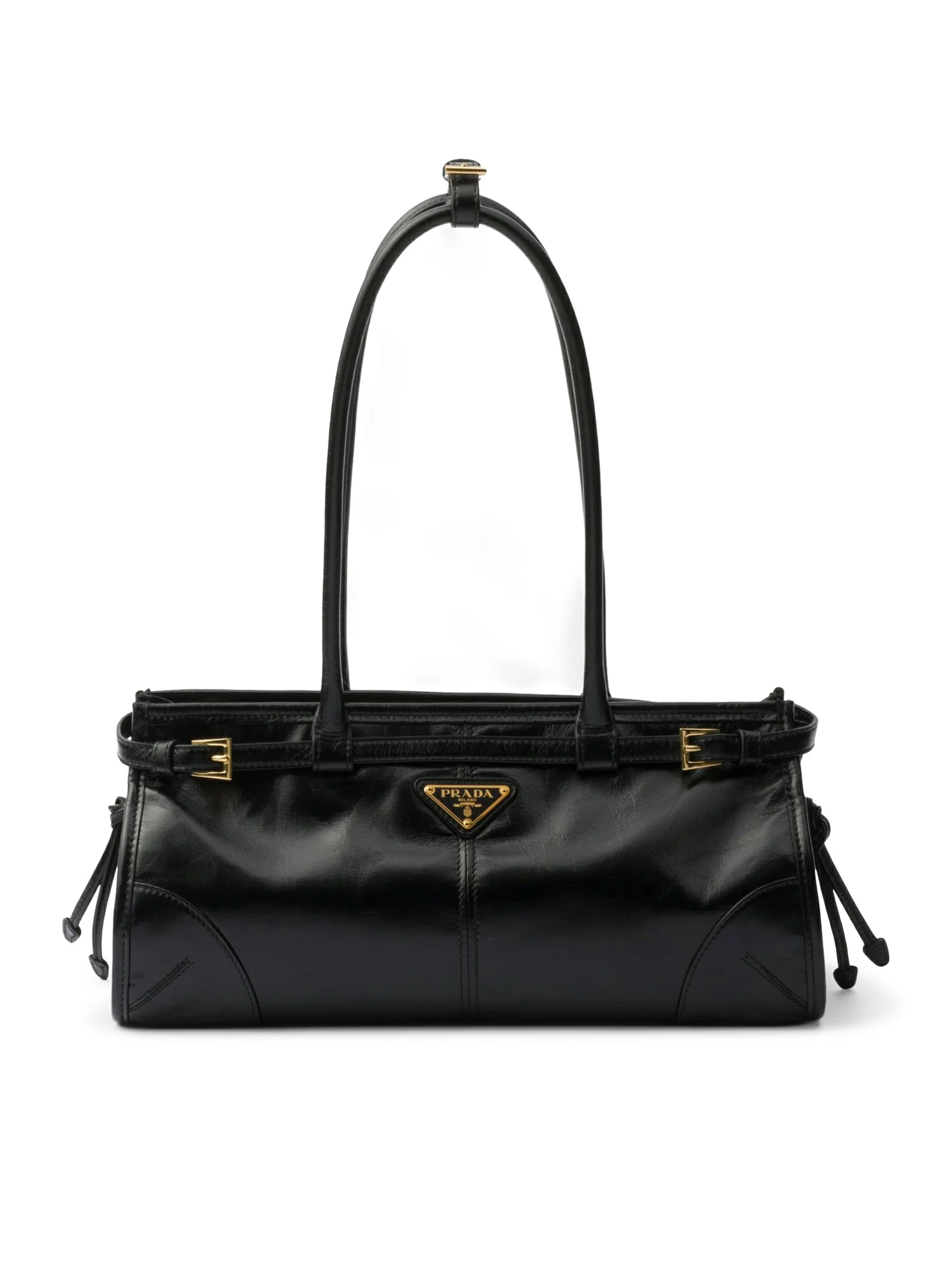 -Leather handles, light 22 cm -Adjustable and removable shoulder strap. Maximum length 125 cm - Minimum length 105 cm - Maximum light 60 cm - Minimum light 50cm -Metal finishes -Logo on front enamelled metal triangle -Interior in nappa and logo nylon with central zip pocket and zip pocket -Height: 15cm -Width: 32cm -Length: 12cm Made in Italy Composition: Calf Leather 100% calf Leather Color code: F0002 BLACK 1BA426VMOO2CYR