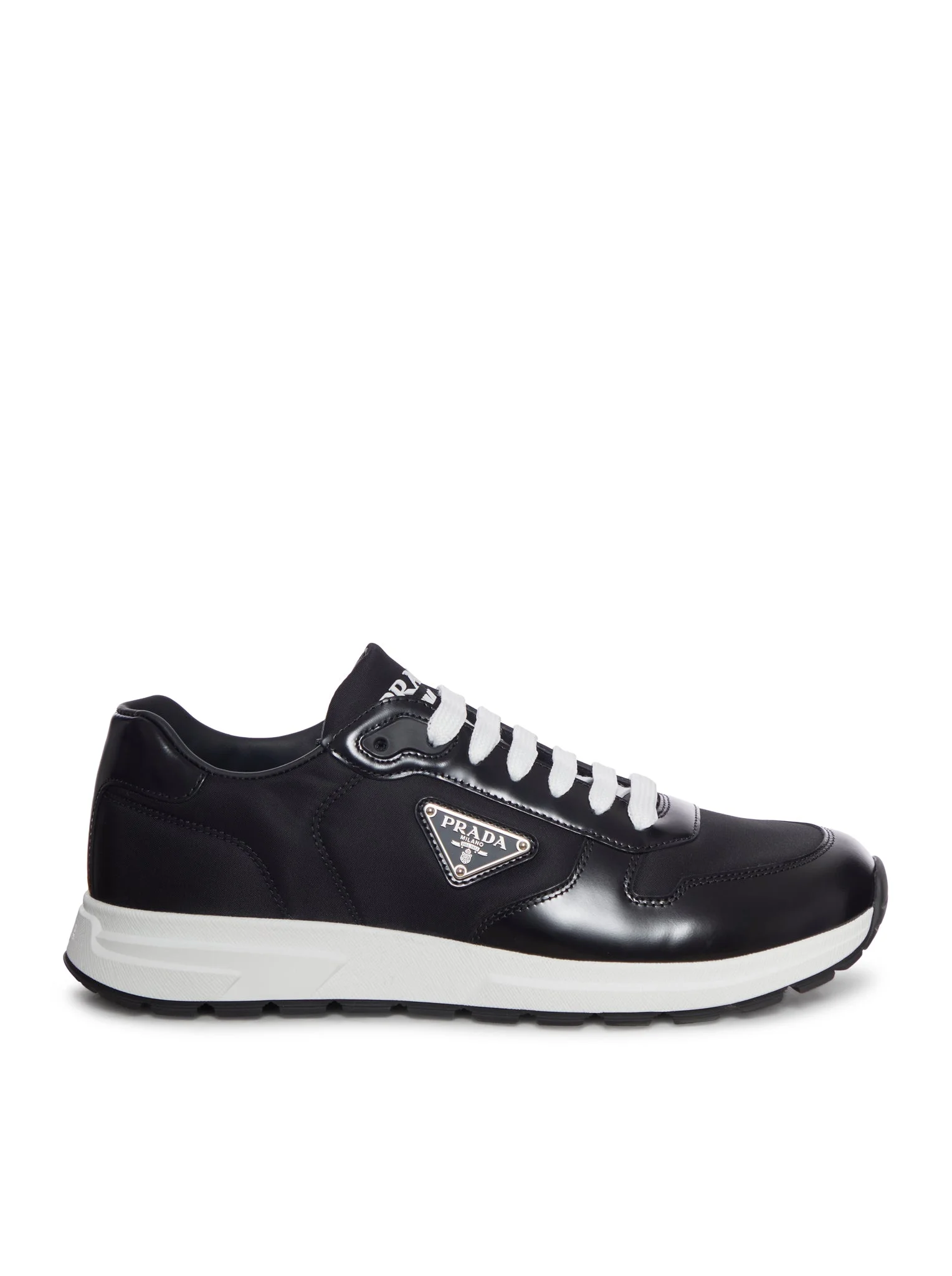 - With laces - Enamelled triangle logo applied on the upper - Prada Milano logo screen-printed on the tongue - Lightweight rubber sole with serrated welt - Sole height 45 mm - Removable leather-covered insole - Color: Black Made in Italy Composition: Polyamide 100% polyamide Color code: F0632 BLACK 1 2EE443FG0003LF5