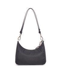 -Leather handle -Adjustable and removable leather shoulder strap -Metal trimmings -Enamelled metal triangle logo on front -Certified Re-Nylon lining Made in Italy Composition: Polyamide 100% polyamide Color code: F0002 BLACK 1BC204VYRO2C4Q
