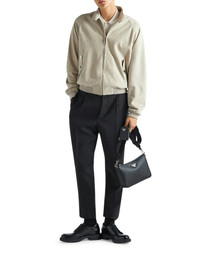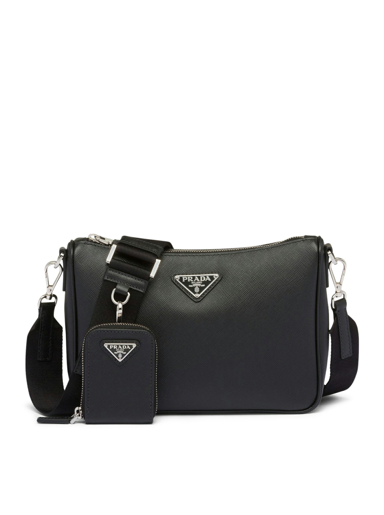 -calf leather -Saffiano leather -enamel triangle logo -top zip fastening -main compartment -adjustable detachable shoulder strap -removable zip pouch Made in Italy Material: Leather Composition: 100% Leather Color code: F0002 BLACK 2VH113VDMP9Z2