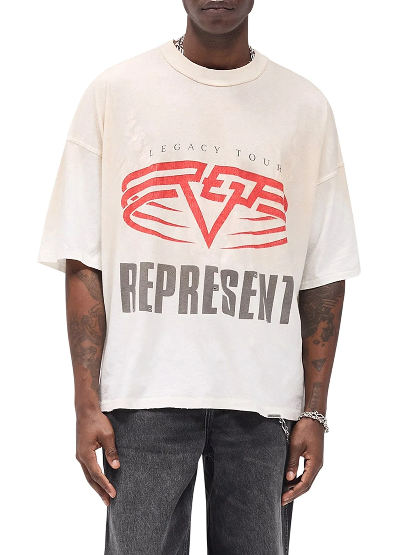 - Reversible Flat White Living Legacy Tour T-shirt - Oversized, boxy fit - Mixed print on both sides - Vintage wash finish - Light distressing and raw edges - Signature metal bar at the hem - Removable labels for bidirectional wear - Color: Washed Ecru Made in Portugal Composition: Cotton 85% Cotton, 15% Hemp Color code: 30 WASHED ECRU MLM100176