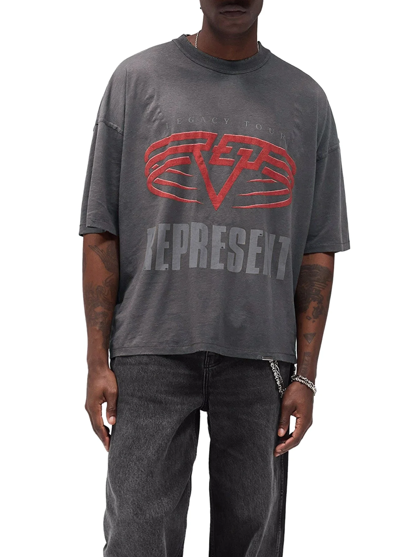 - Reversible Flat White Living Legacy Tour T-shirt - Oversized, boxy fit - Mixed print on both sides - Vintage wash finish - Light distressing and raw edges - Signature metal bar at the hem - Removable labels for bidirectional wear - Color: Sun Fade Grey Made in Portugal Composition: Cotton 85% Cotton, 15% Hemp Color code: 46 SUN FADE GREY MLM100176