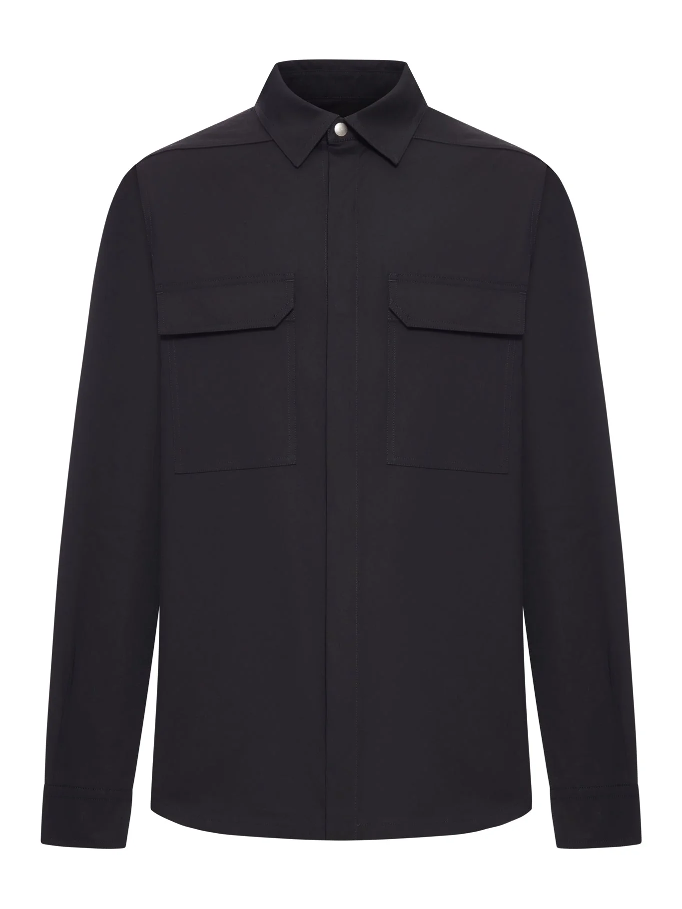 - Classic collar - Concealed front closure - Two front patch pockets with flaps - Long sleeves with adjustable button cuffs - Back yoke with fabric band - Curved hem - Cotton blend - Color: Black Made in Italy Composition: Cotton 97% cotton 3% elastane Color code: 09 BLACK RU01F2236TE