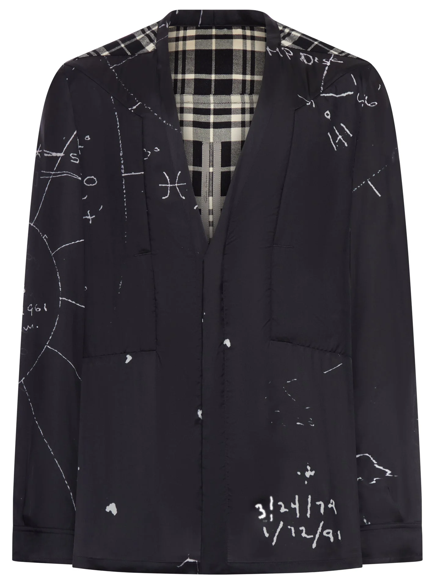 - Front closure - V-neck - Front pockets - Long sleeves with adjustable cuffs - Contrasting graphic details printed on the front - Checked back panel - Finished hem - Oversized fit - Color: Black/Milk Made in Italy Composition: Viscose 52% Viscose 48% Cupro Color code: 09119P BLACK MILK BLACK PLAID RU01F2290KP1CP