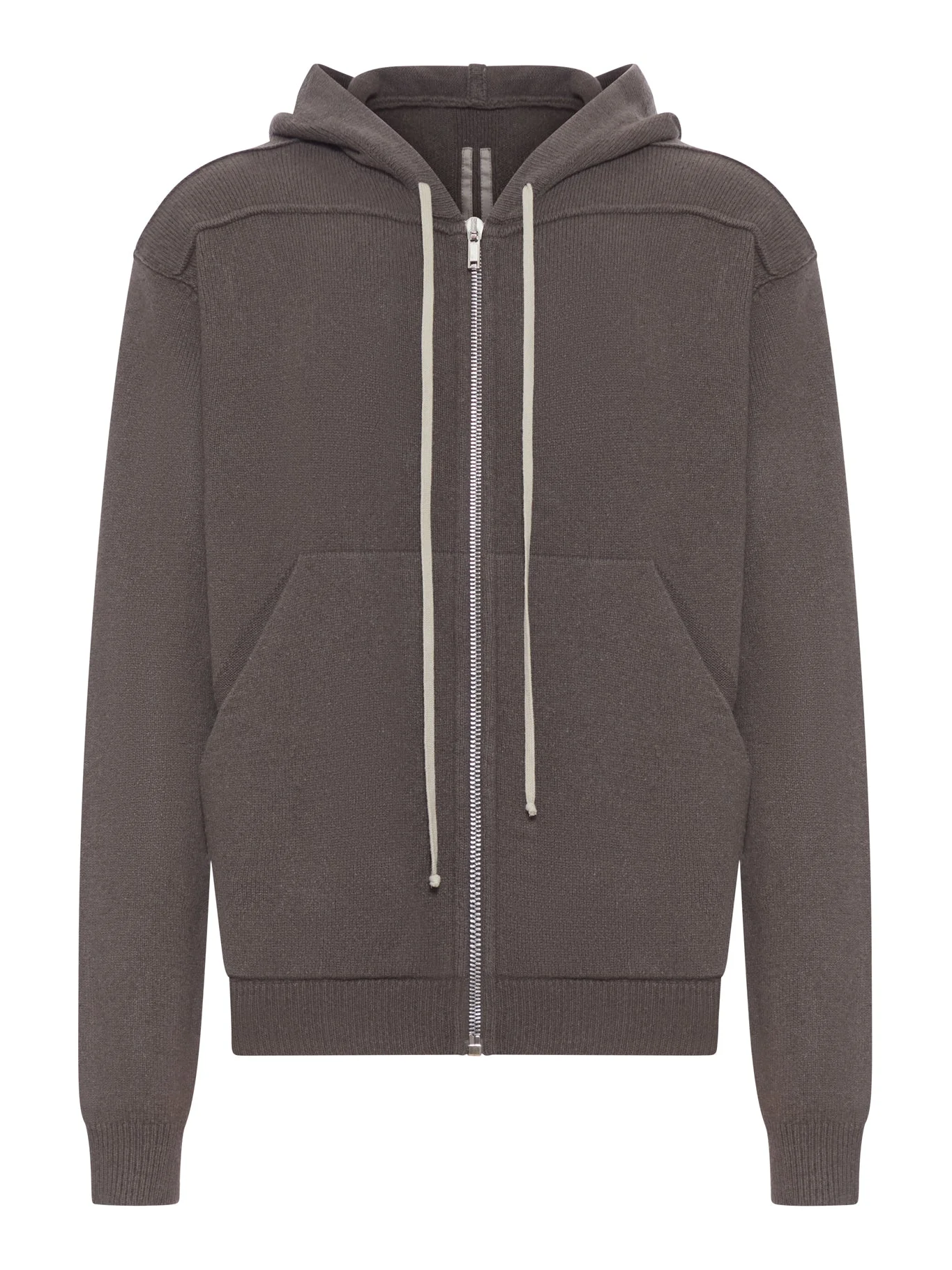 - Adjustable hood with contrasting drawstring - Front metal zip closure - Long sleeves - Slightly dropped shoulders - Two front kangaroo pockets - Ribbed hem and cuffs - Cashmere blend - Color: Darkdust Made in Italy Composition: Cashmere 97% Cashmere 3% Wool Color code: 78 DARKDSUT RU02E1614WSBR