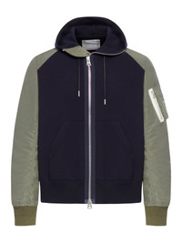 -Hood with drawstring -Front zip with double slider -Wide sleeves with nylon darts and side pocket -Elastic cuffs and hem -Blue/military green Made in Japan Composition: Cotton 62% Cotton 38% Polyester Color code: 212 NAVY KHAKI 2503624M