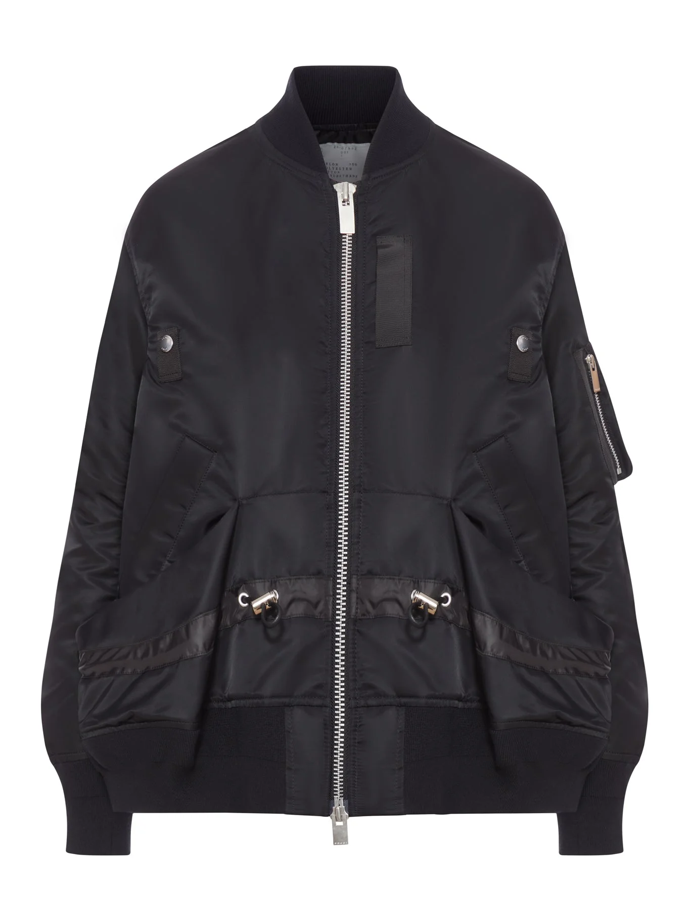 - Technical fabric with a satin finish - Two-way metal zip closure - Left sleeve pocket with zip - Elasticated ribbed collar, cuffs, and hem - Pleated band detail on the back for a structured effect - Adjustable drawstring band detail on the front - Color: Black Made in Japan Composition: Nylon 100 % nylon Color code: 001 BLACK 2507992