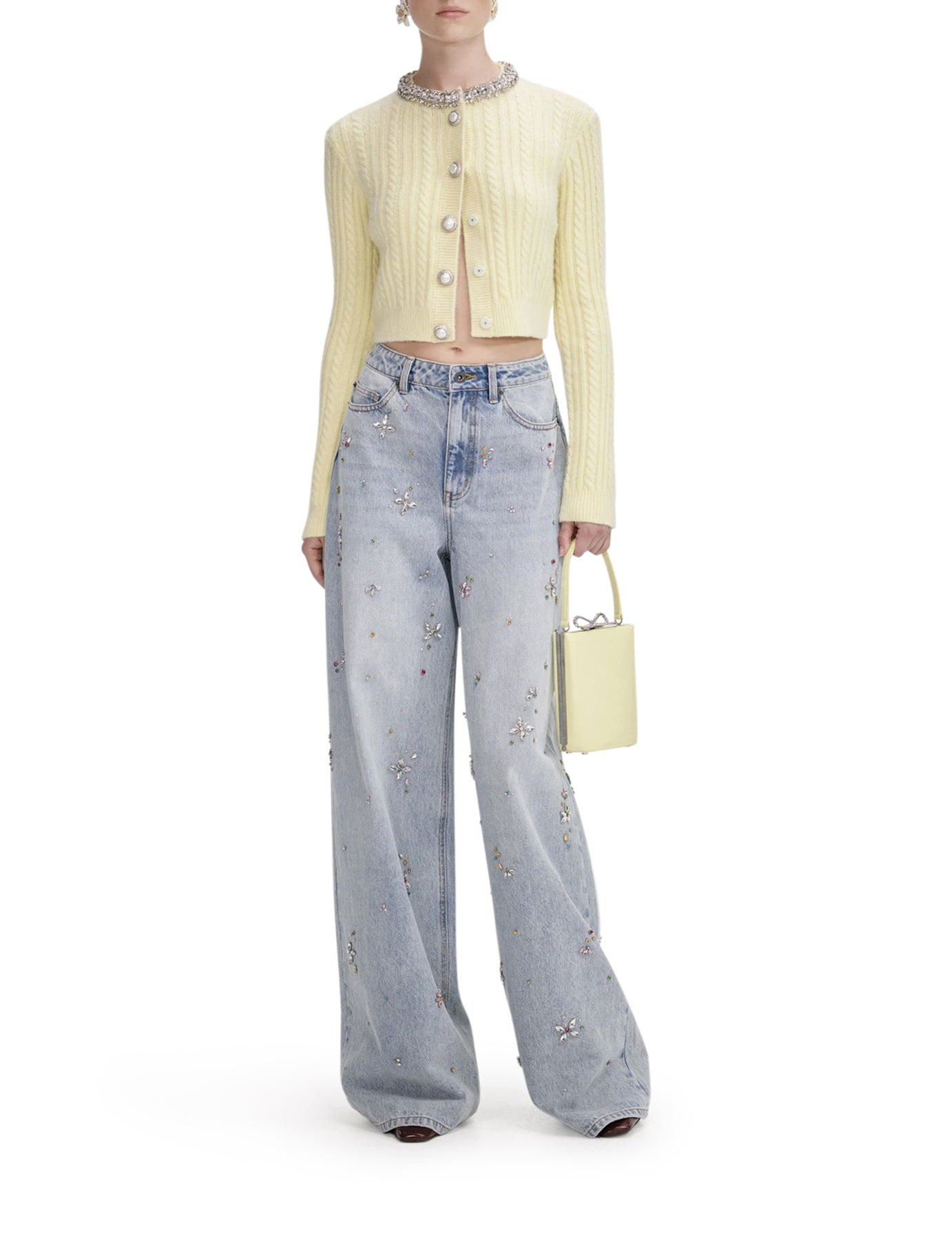 - Crew neck with rhinestones - Long sleeves - Stretch fabric - Front button closure - Cable knit details - Decorative buttons - Ribbed cuffs and hem Made in China Composition: Polyamide 56% polyamide 30% wool 14% alpaca Color code: YELLOW AW25121CAY