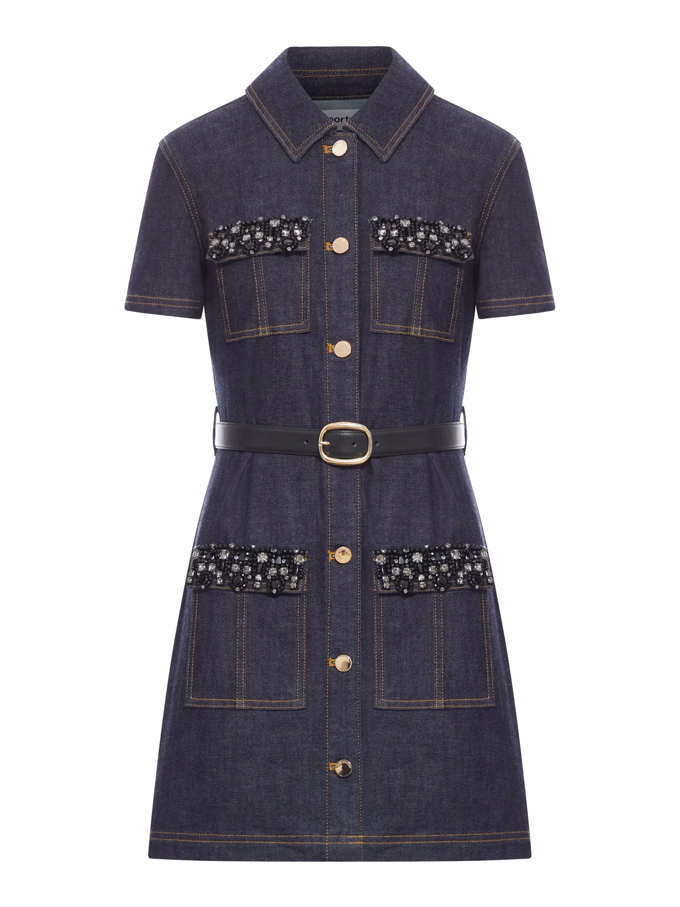 - Classic collar - Front button closure - Functional flap pockets with jeweled details - Short sleeves - Waist belt loops - Adjustable and removable belt - Contrast stitching - Cotton blend - Color: Dark Blue Made in China Composition: Cotton 94% Cotton 5%PES 1% Elastane Color code: BLUE AW25812SBL