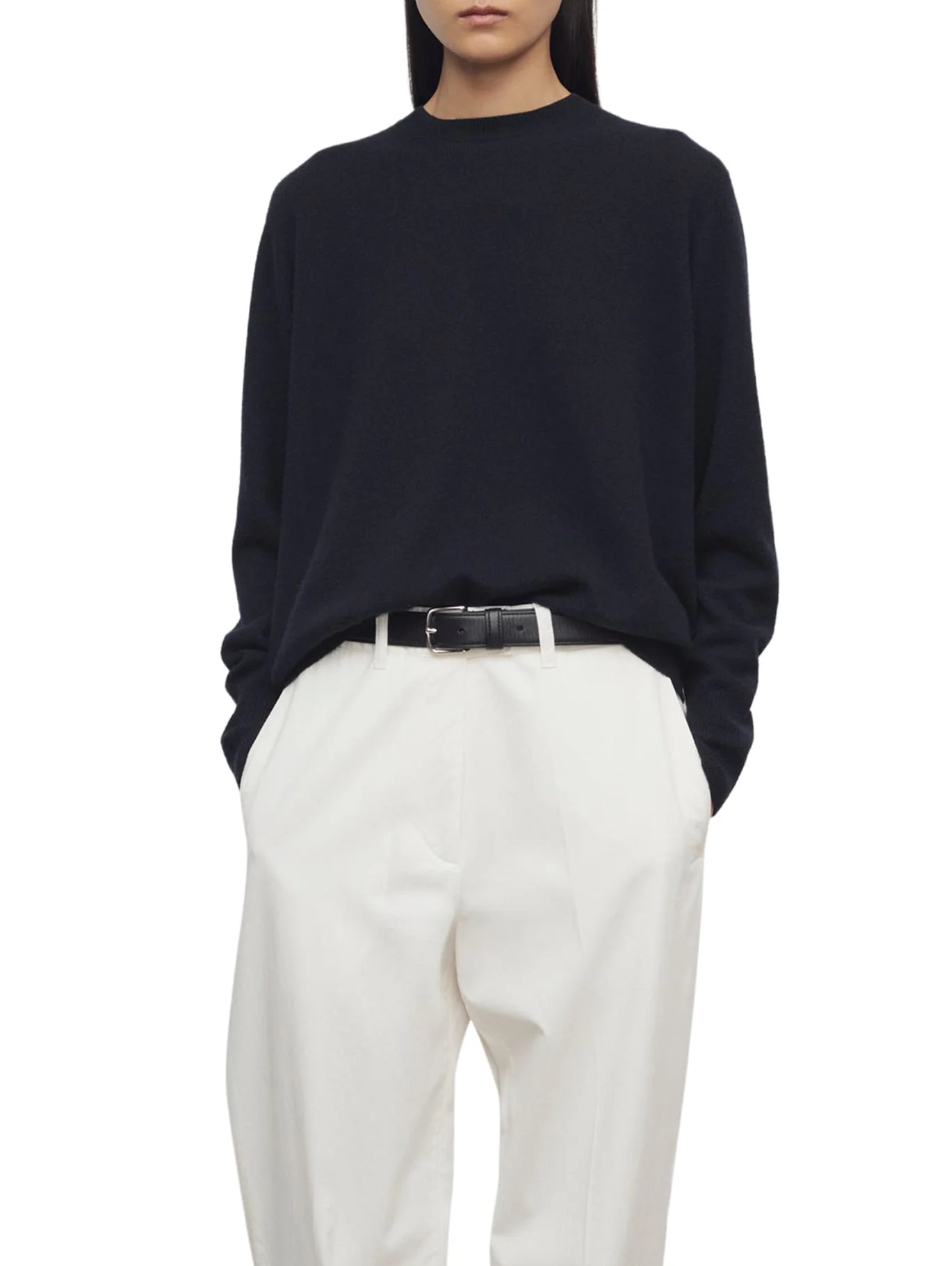 - Classic sweater - Crew neck - Relaxed fit - Seamless design - Ribbed collar, cuffs, and hem - 100% cashmere - Color: Dark Navy Made in Italy Composition: Cashmere 100% Goat cashmere Color code: DRN DARK NAVY 10037Y556