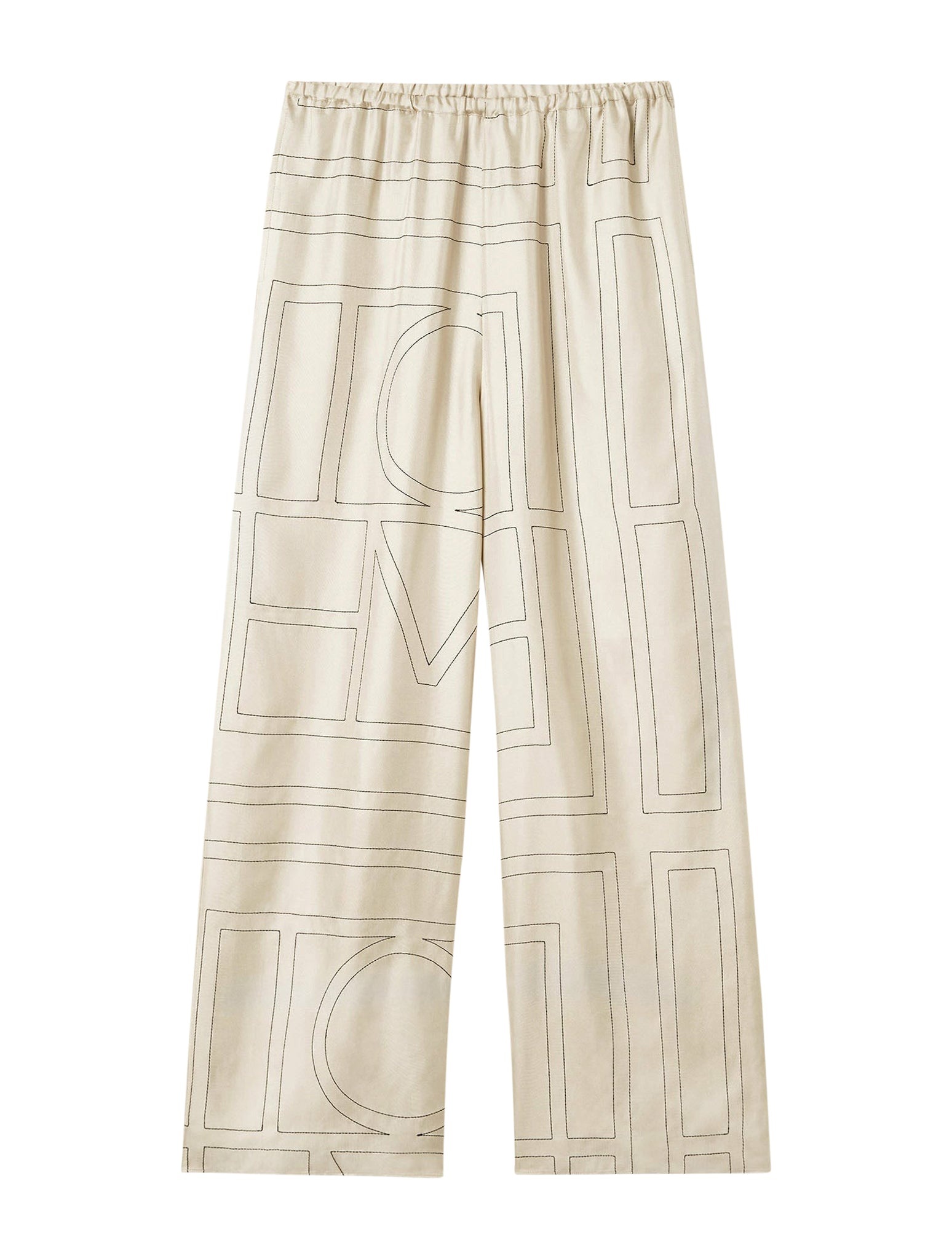 TOTEME trousers crafted from fluid, mid-weight silk twill embroidered with a subtle monogram motif in contrasting black thread -relaxed silhouette -straight leg -finished with elasticated waist -side pockets Made in China Composition: Silk 100% Silk Color code: 926 IVORY MONOGRAM 213255707