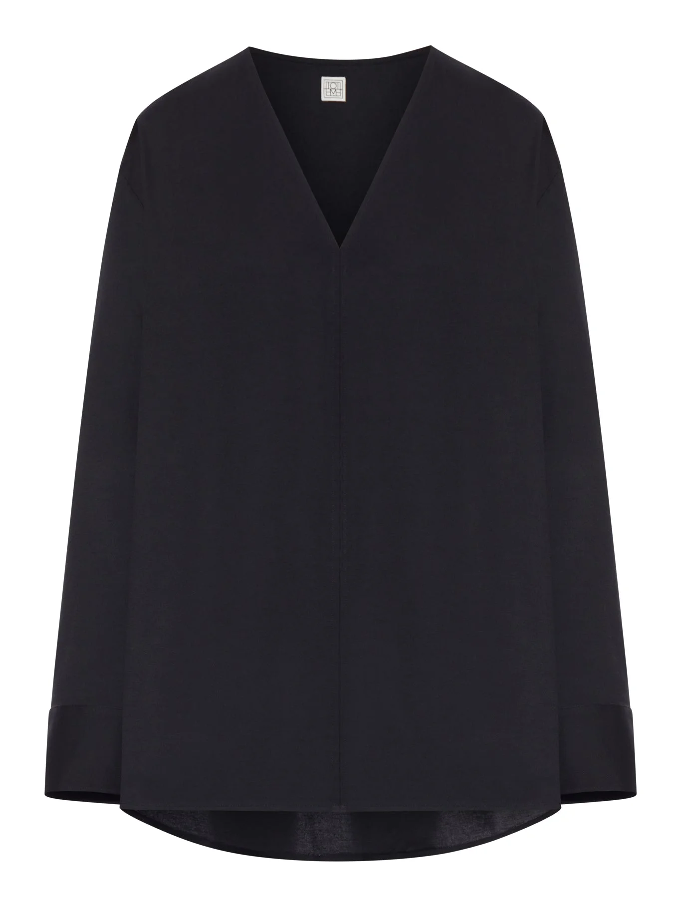 - Blouse with a clean, refined silhouette - Flowing, compact fabric - Deep, clean V-neck - Construction with a back yoke and center pleat - Long sleeves with an open front - Structured cuffs with a button closure - Soft, comfortable fit - Slightly rounded hem - Color: Black Made in Turkey Composition: Viscose 100% Viscose Color code: 001 BLACK 262WRT0674FB0600