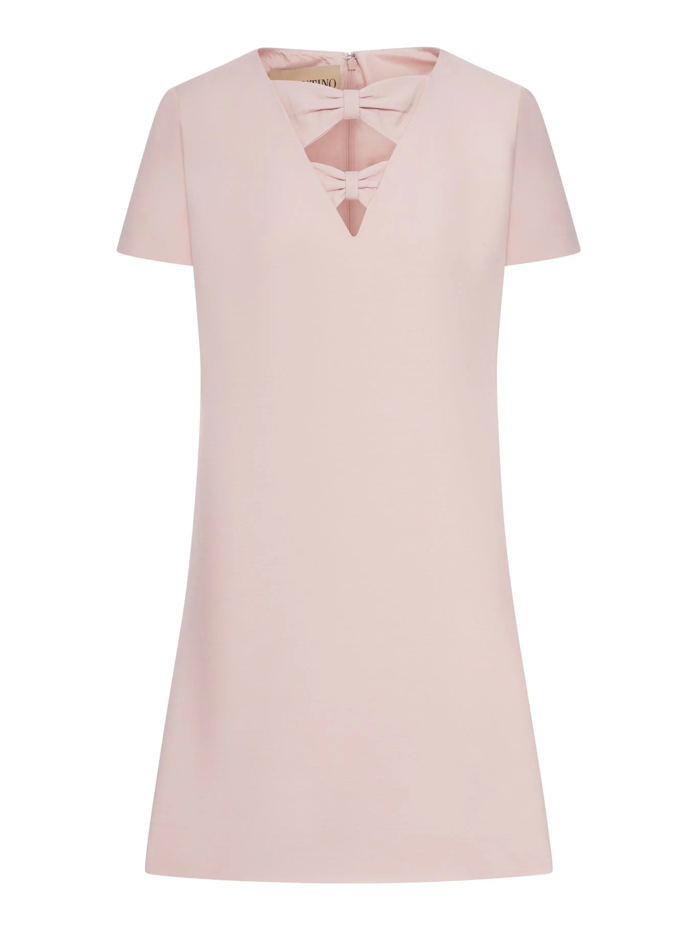 - Straight, clean line - V-neck - Decorative double bow detail on the front - Short sleeves - Invisible zip closure on the back - Minimal stitching - Regular fit - Above-the-knee length - Lined - Color: Pink Made in Italy Composition: Wool 65% Virgin wool 35% Silk Color code: R13 ROSE 8B3VAHT51CF