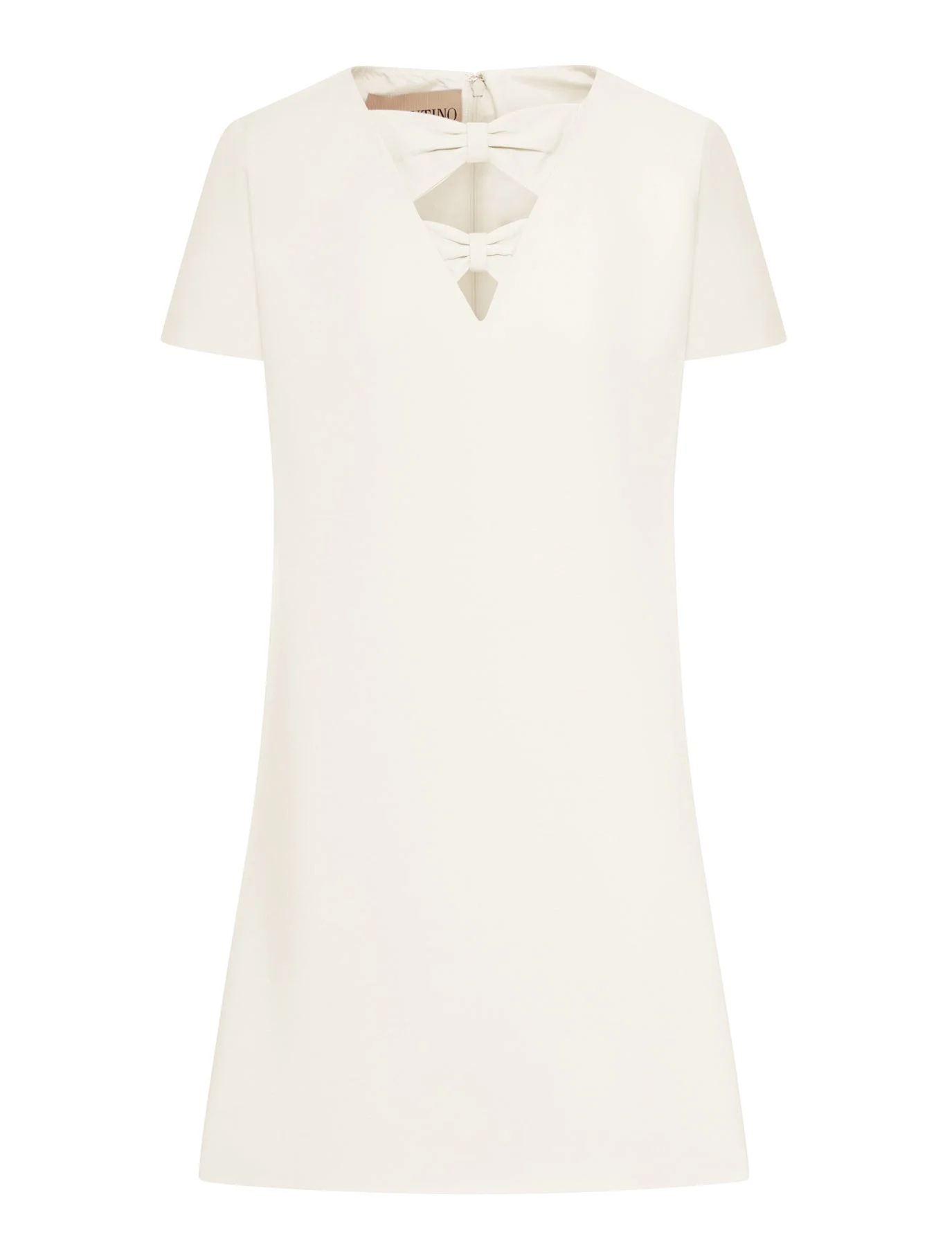 - Straight, clean line - V-neck - Decorative double bow detail on the front - Short sleeves - Invisible zip closure on the back - Minimal stitching - Regular fit - Above-the-knee length - Lined - Color: Ivory Made in Italy Composition: Wool 65% Virgin wool 35% Silk Color code: A03 IVORY 8B3VAHT51CF