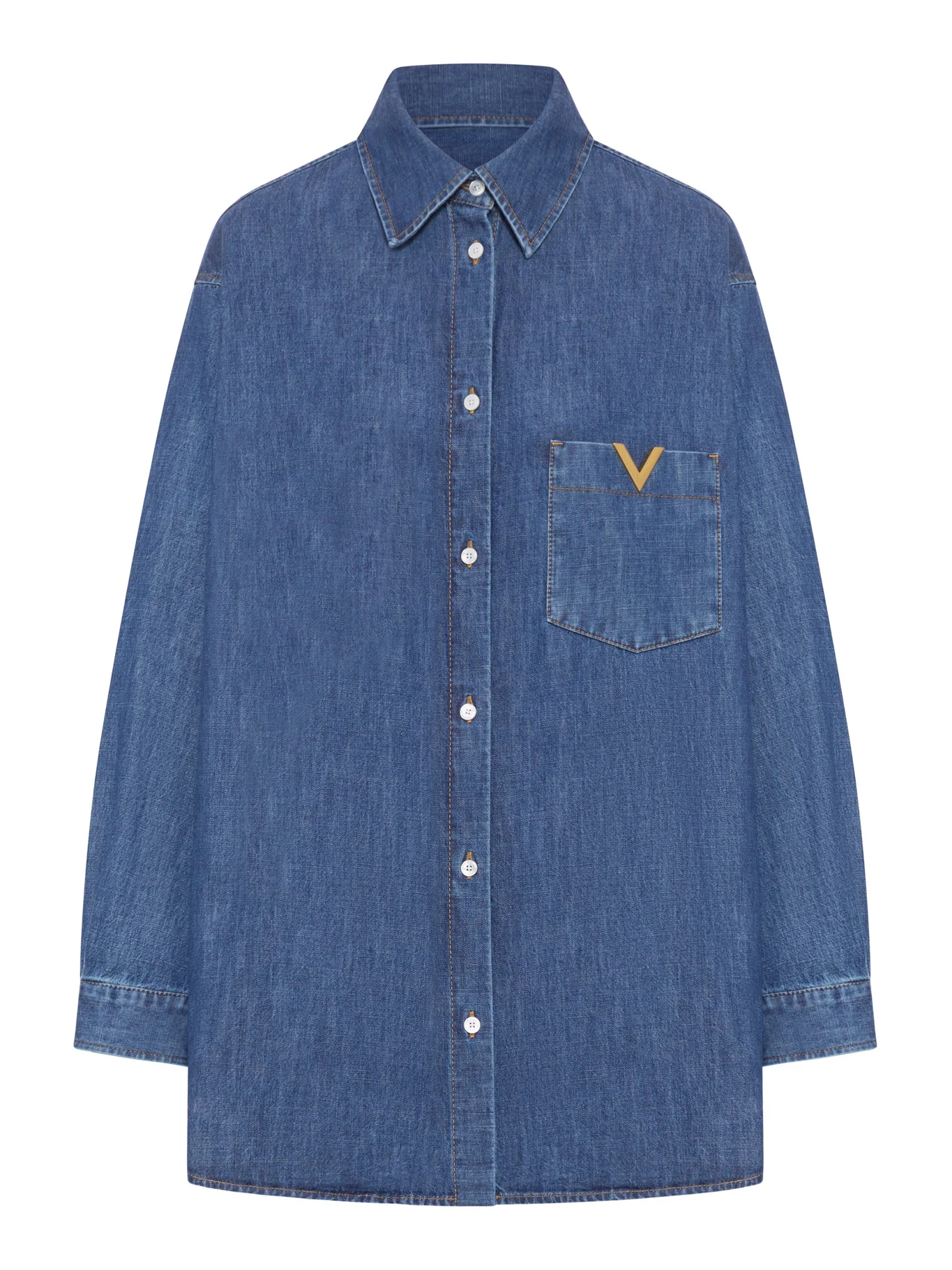 - Classic collar - Front button closure - Long sleeves - Adjustable buttoned cuffs - Curved hem - Chest pocket with metallic V logo detail - Contrast stitching - 100% cotton - Color: Medium Blue Made in Italy Composition: Cotton 100% cotton Color code: 558 MEDIUM BLUE DENIM 8B3DB03K9YA