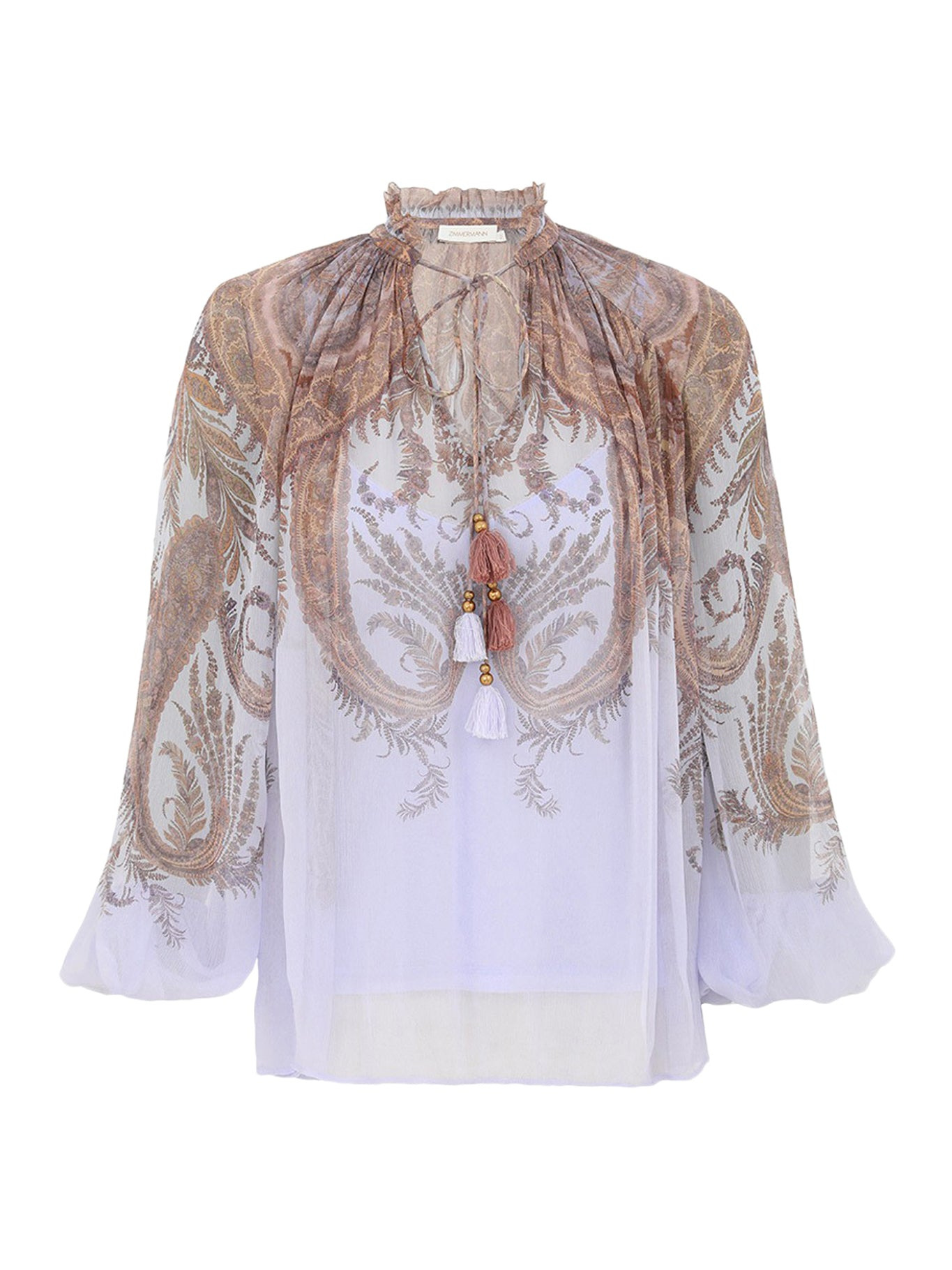 - V-neck - Ruffled stand-up collar - Voluminous gathering throughout - Relaxed fit - Matching drawstring tie at the neckline - Long puff sleeves with elasticated cuffs - Gathering at the front and back - Comes with a separate tank top Made in China Composition: Viscose 100% Viscose Color code: LPSL LILAC PAISLEY 0991TF251