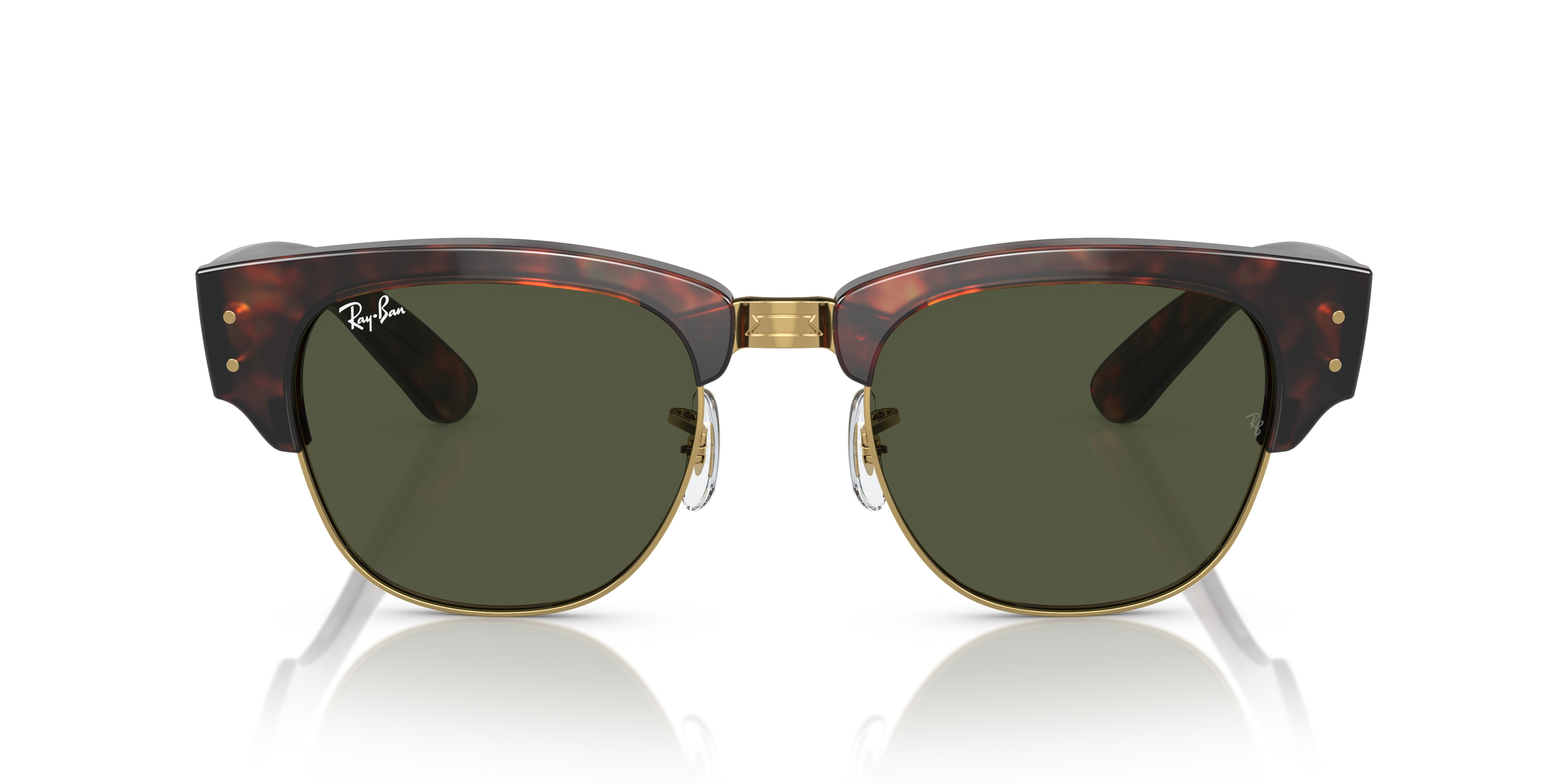 Ray-Ban Mega Clubmaster sunglasses are a square-shaped frame with a polished gold tortoise finish on the front and green classic G-15 lenses. This unisex model, featuring a unique color combination of tortoise on gold, is designed for those who want to make a statement without being too flashy. The squared shape of these sunglasses gives them an edgy look that's perfect for any occasion. PRODUCT INFORMATION STYLE RB0316S Mega Clubmaster MODEL CODE RB0316S 990/31 50-21 MADE IN Italy FRAME DETAILS COLOR Tortoise MATERIAL Injected SQUARE Square LENS DETAILS COLOR G-15 Green MATERIAL Crystal TECHNOLOGY Green LENS PROTECTION INDEX 3N