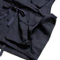 This field vest has many functional and active details such as large three-dimensional pockets, side pockets, snap buttons, and drawcords. It is a highly utilitarian item that can be layered inside or outside of outerwear or jackets. The high-count twill fabric woven in high density is thin and durable and has a refined luster despite being made of cotton. 【Product Details】 - Country of Origin: USA - Color: Dark Navy - Size: S, M, L - Material: 100% Cotton - Model Wearing Size: S (169cm 56kg)