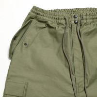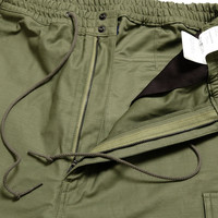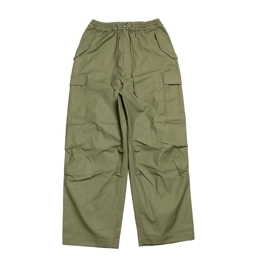 ArkAirとのコラボレーションで生まれた、ミリタリー感漂うワイドカーゴパンツ。 【Product Details】 - Country of Origin: Japan - Color: Olive - Size: S, M, L - Main: 97% Cotton / 3% Polyurethane - Model Wearing Size: - (-cm -kg)