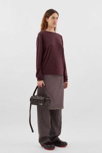 Classic fit longsleeve roundneck in burnt aubergine super light wool jersey featuring self fabric borders on collar, bottom sleeves and hem with SUNNEI branded gros gain on bottom left. 71%WO 24%PA 5%EA Materials from Portugal Made in Portugal