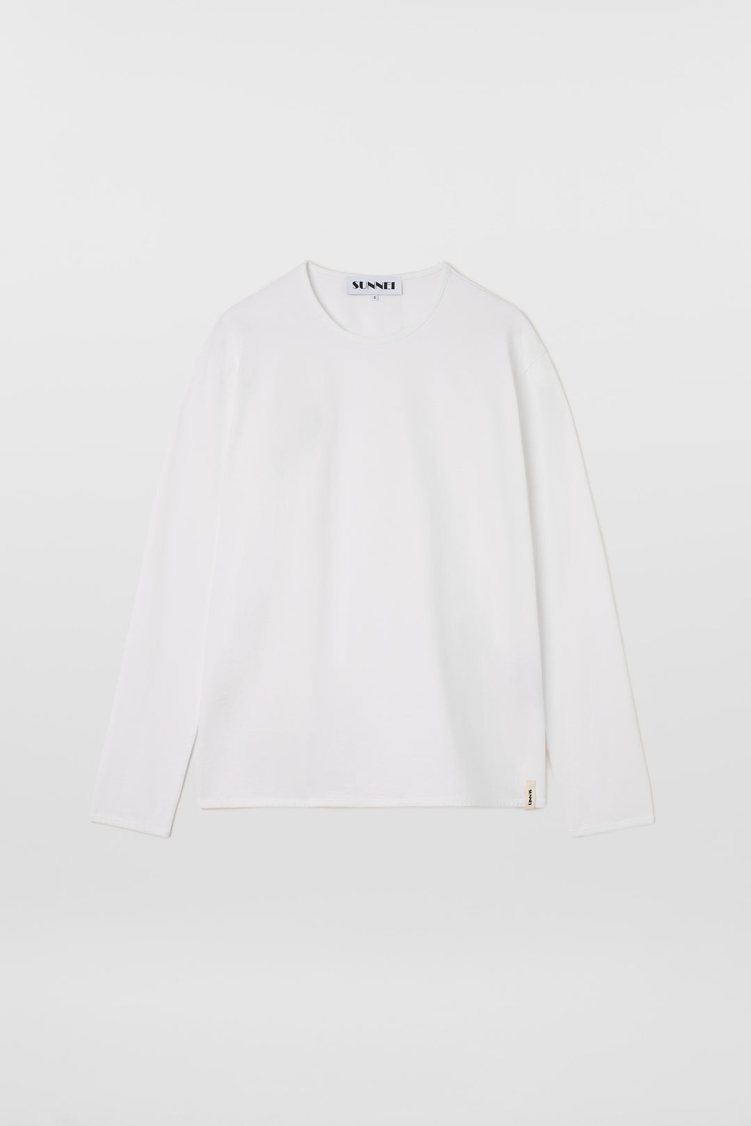 White garment-dyed classic-fit crewneck longsleeve t-shirt featuring piping on collar and hems and SUNNEI gros grain on front bottom left. 100% CO Materials from Portugal Made in Portugal Momo is wearing a size M. Model measures: Height: 187cm Chest: 75cm Waist: 63cm Hips: 85cm Shoe: 43