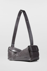 Duffel twisted bag in grey-washed calf leather with cross-bag zipper closure and adjustable shoulder strap. Two side pockets with magnetic closures and debossed logo on front. Internal canvas lining and internal pocket with zip. Bag size: H: 15cm L: 35cm W: 13cm Shoulder strap drop: min 24cm — max 60cm 100% LE / 100% CO Materials from Italy Made in Italy